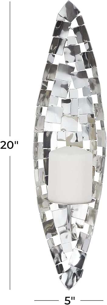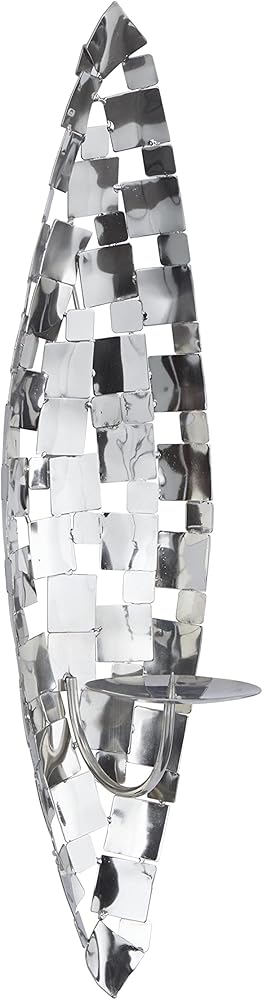 Illuminate your home with a soft radiant glow of this silver diamond shaped wall sconce that carries stunning design to accentuate your open wall space. Can hold one pillar candle. This item ships in 1 carton. Can be hung vertically using the metal rings; nails and screws not included. Suitable for indoor use only. This item ships fully assembled in one piece. Made in India. This is a single silver colored candle sconce. Contemporary style.
