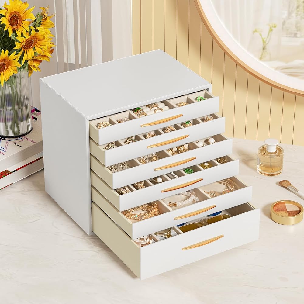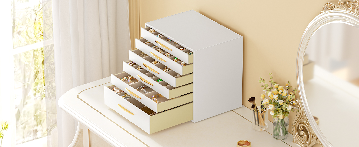 صندوق مجوهرات سريواتانا، منظم مجوهرات من 6 طبقات، 6 أدراج لتخزين المجوهرات للأقراط والخواتم والقلائد والأساور، طراز حديث، هدايا عيد الميلاد، أبيض وذهبي