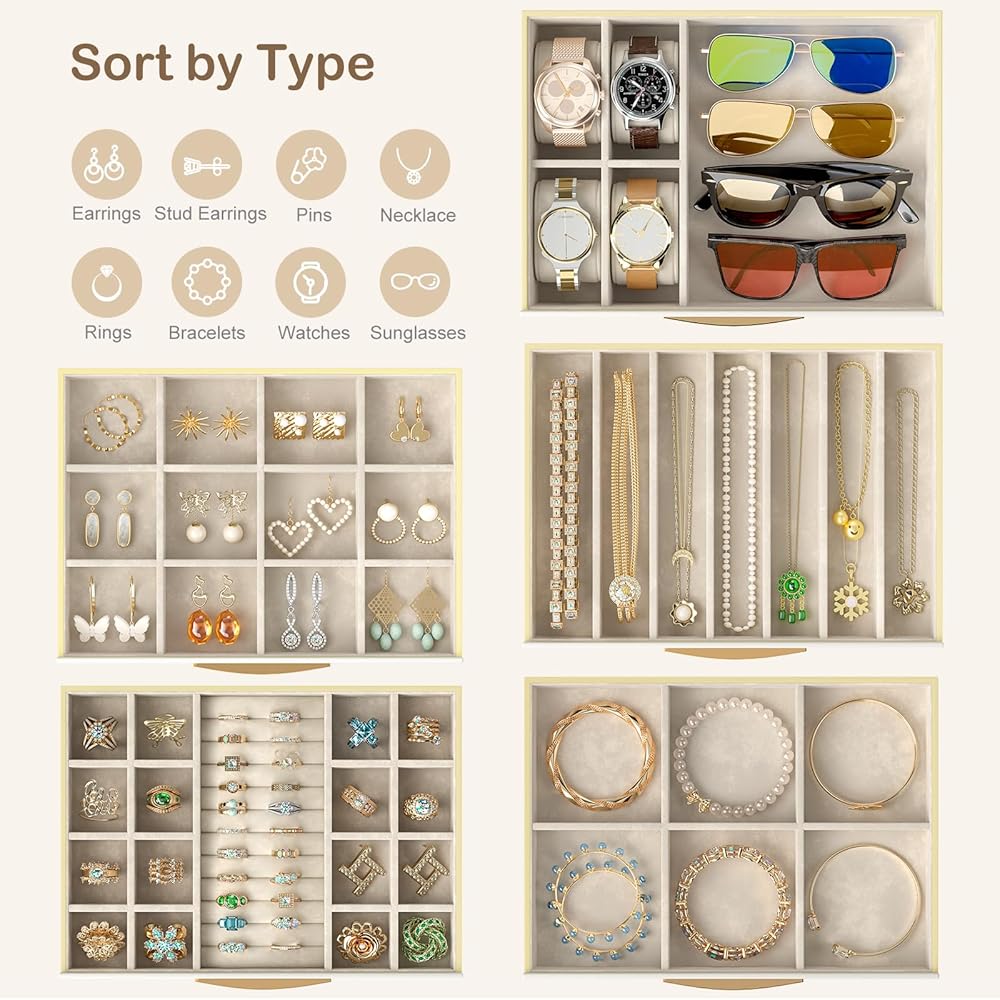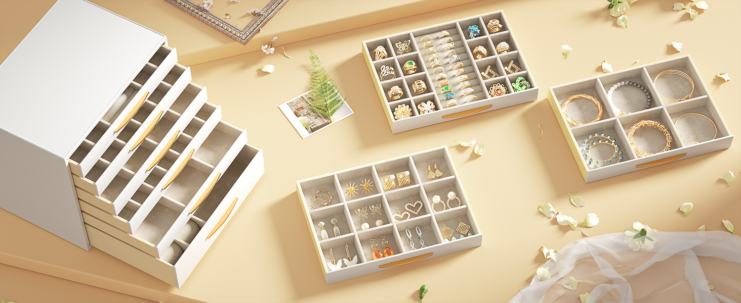 • استمتع بحياة منظمة - قم بتصنيف واستيعاب مجوهراتك المتنوعة، 1 درج للساعة/النظارات الشمسية، 1 درج للقلادة، 4 أدراج مقسمة للأساور، وأزرار الأذن، ودبابيس الشعر، وأزرار الأكمام، ودبابيس الزينة وما إلى ذلك.