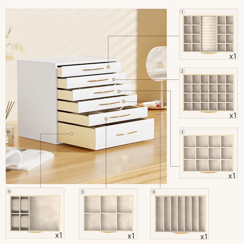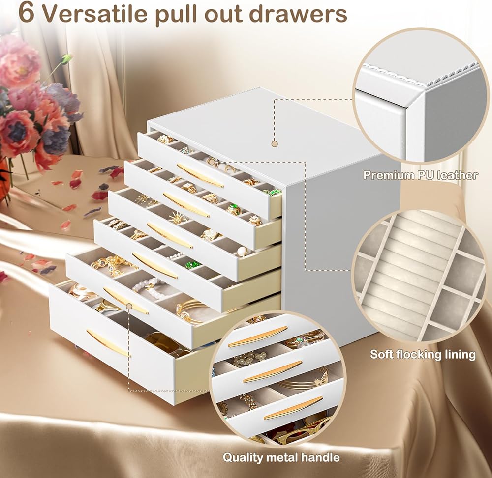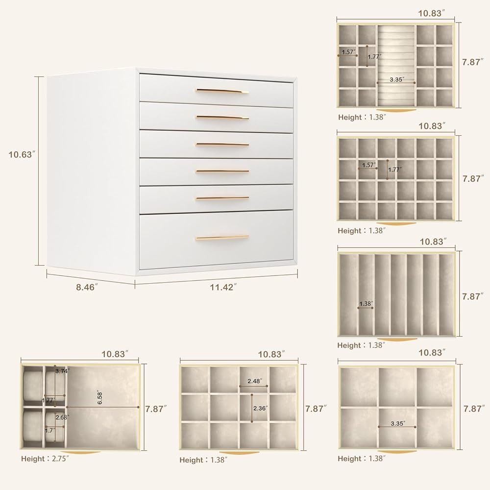 • 6 طبقات ذات سعة كبيرة: يتميز بـ 6 أدراج قابلة للسحب، يمكن لصندوق المجوهرات الأبيض متعدد الاستخدامات هذا تخزين قطع صغيرة من المجوهرات في فتحات مختلفة من الطبقات العليا. الوسائد الناعمة في الدرج السفلي مثالية لتخزين الساعات. تم تصميم درج أعمق للنظارات الشمسية أو المجوهرات الكبيرة.