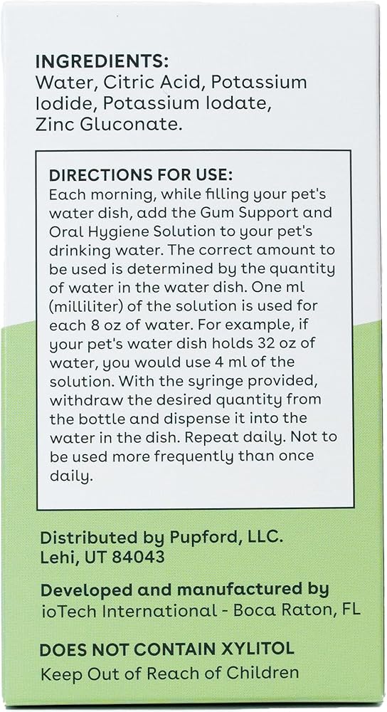 Taking care of your pet's teeth is one of the hardest things to keep up with. Pet mouth problems are hard to notice but can cause your pet a lot of pain. At age 2, 80% of dogs have some form of periodontal disease. Stay on top of your pet's dental health the easy way with a simple supplement you add to your pet's water once each day. Pupford's Gum and Oral Hygiene Solution: Is the best dog water additive: Get real protection for your dog's dental health. This formula gives teeth and gums molecular iodine cleaning, powerful breath freshener, and controls tartar, calculus, and plaque buildup. It is clinically proven to give you the best for your dog's dental care. Is more effective: The patented molecular iodine technology is also used for human dental care. Thousands of dentists and dental hygienists make molecular iodine their first choice as a mouthwash. It's a perfectly, safe, natural supplement that can be used every day. Has a totally great taste: Pupford's Gum and Oral Hygiene Solution has a great taste that pets love. It is natural and non-toxic, freshens bad breath, and keeps gums and teeth healthy. Simple and easy to use with a measuring syringe included, so adding to a dog's drinking water is a breeze.