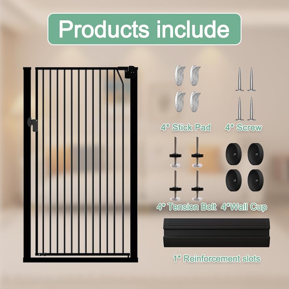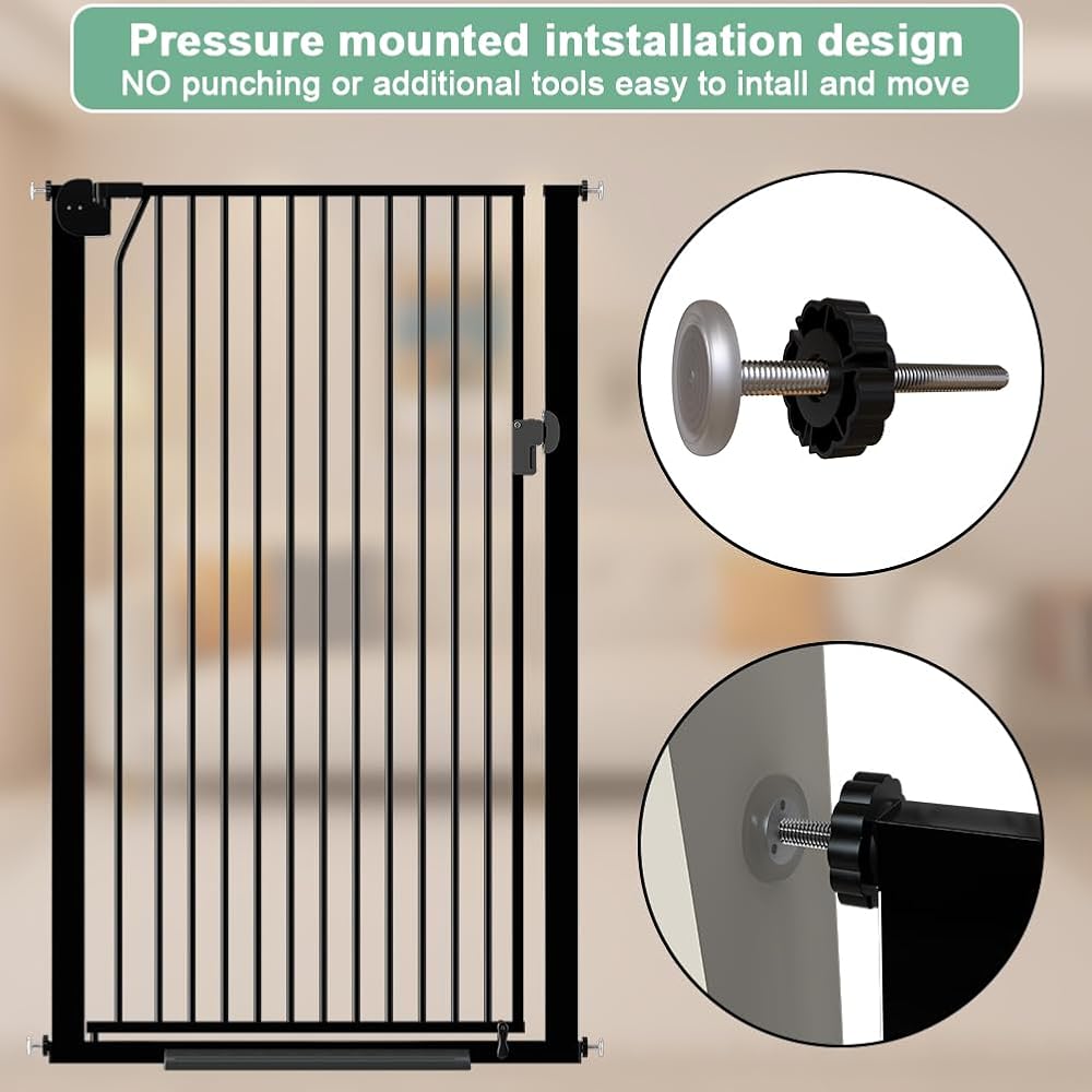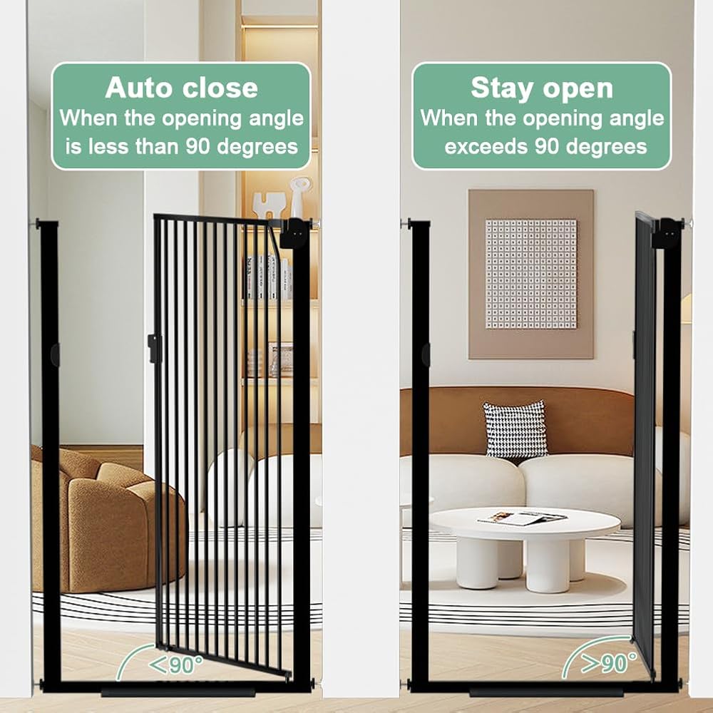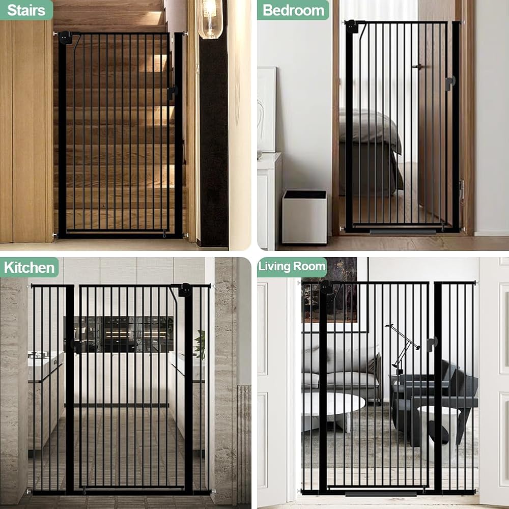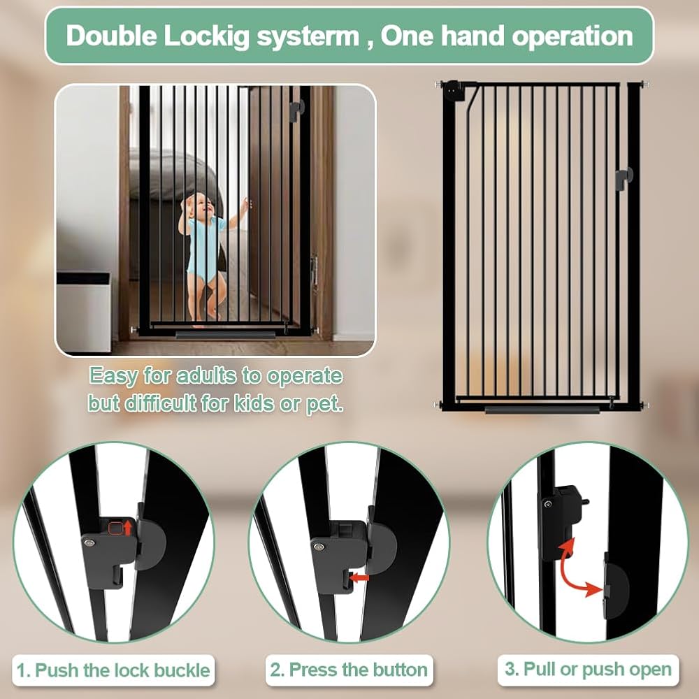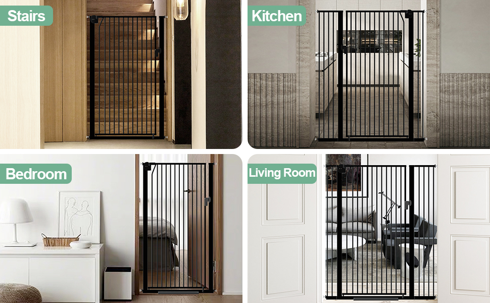 تصميم أمان مزدوج القفل: سياج بوابة الحيوانات الأليفة طويل جدًا يتميز بتصميم آمن في الجزء العلوي من المزلاج، ما عليك سوى فتح مزلاج الأمان للمرور من خلاله، وأغلق مزلاج الأمان لمنع الحيوانات الأليفة أو الأطفال من فتحه بسهولة. يعتبر هذا السياج ذو القفل المزدوج فعالاً للغاية في منع الحيوانات الأليفة أو الأطفال من فتحه عن طريق الخطأ. وهذا يجعله خيارًا آمنًا