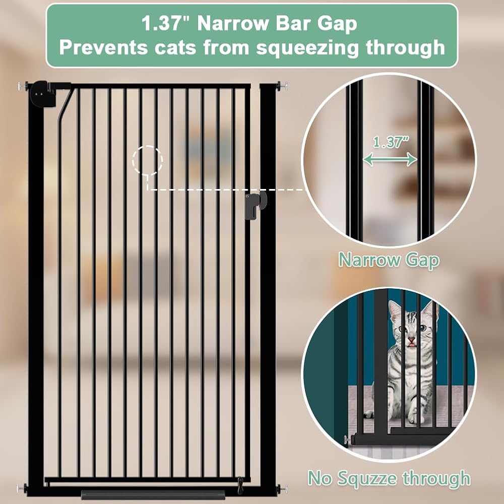 مسافة ضيقة للغاية: بوابة قطط طويلة جدًا، المساحة بين الأنابيب 1.37 بوصة، ضيقة جدًا بحيث لا تتمكن الحيوانات الأليفة من الحفر منها أو لصق رؤوسها بينها، مما يمنع الجراء أو القطط أو الأطفال من الضغط من خلالها أو حمايتهم بشكل أفضل. من الخطر.