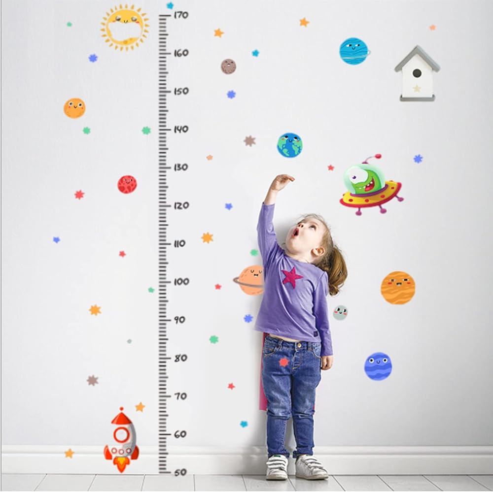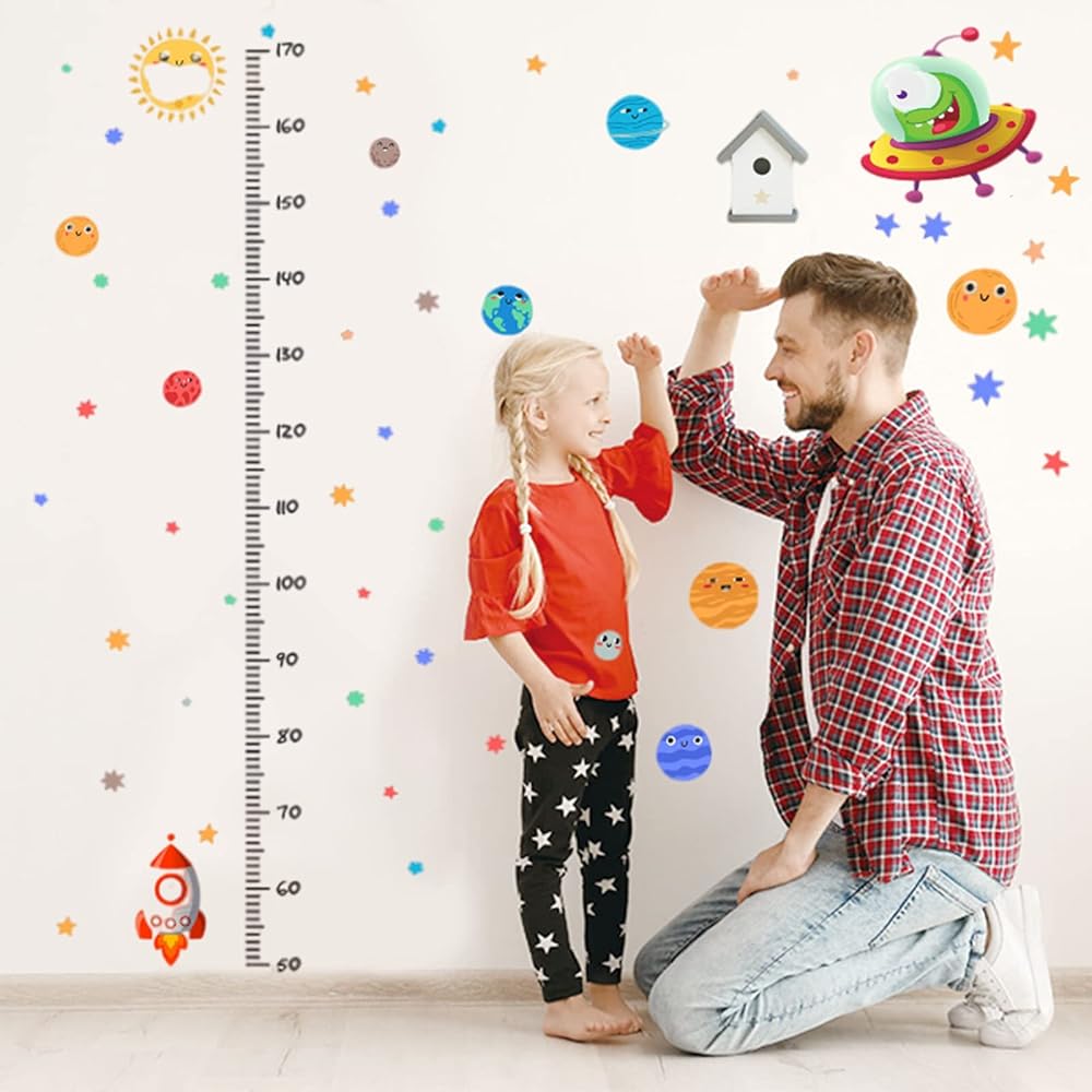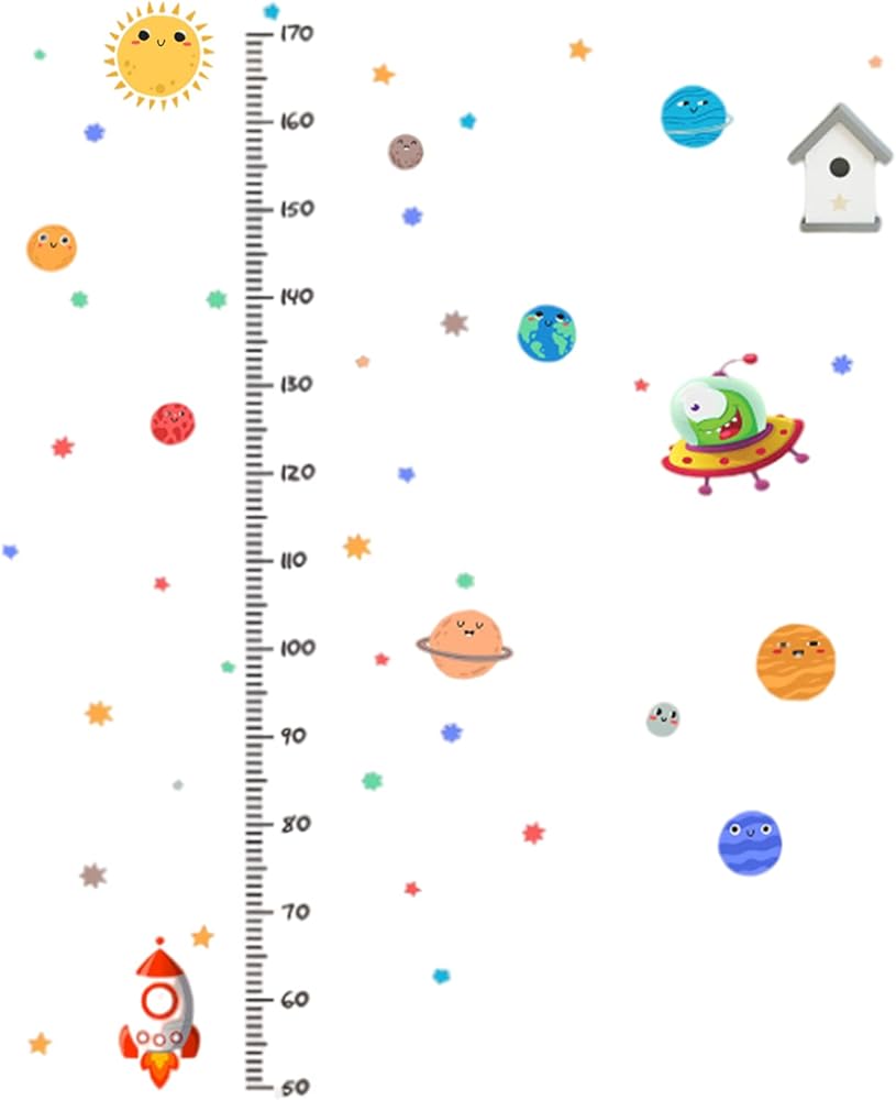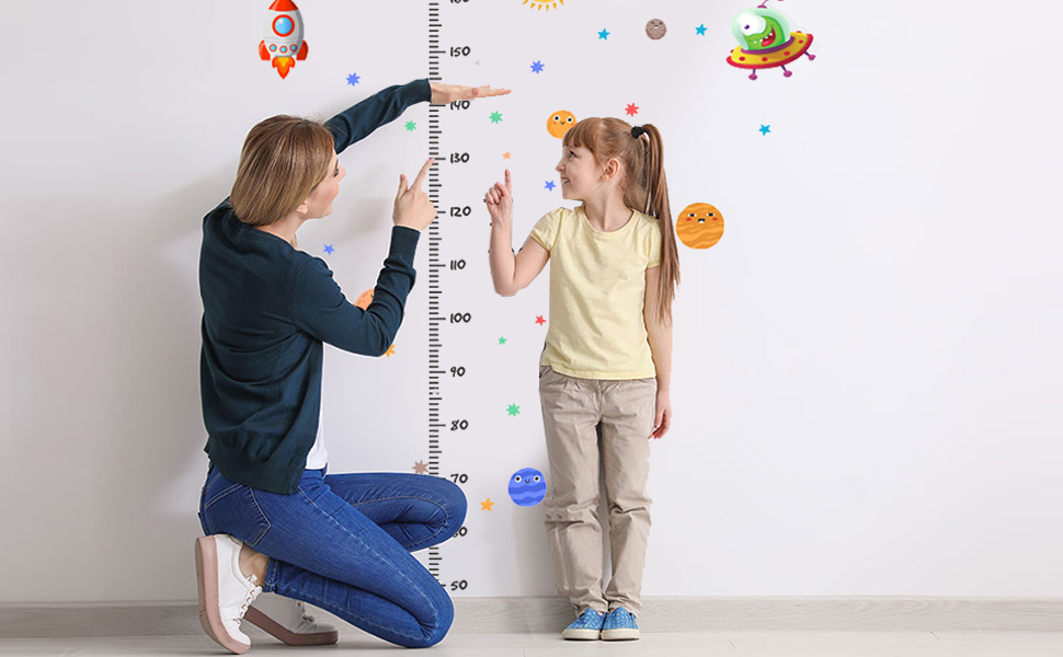 🚀استخدامات متعددة: يمكن وضعها على أي سطح أملس مثل الجدران والأبواب وغرف النوم وغرف المعيشة وغرف اللعب وديكورات المنزل. إنها ليست مجرد أداة ضرورية ومفيدة لقياس طول الأطفال، مما يساعد الأطفال على قلق أكثر بشأن طولهم، ولكن أيضًا طريقة ممتعة لتزيين الغرفة.