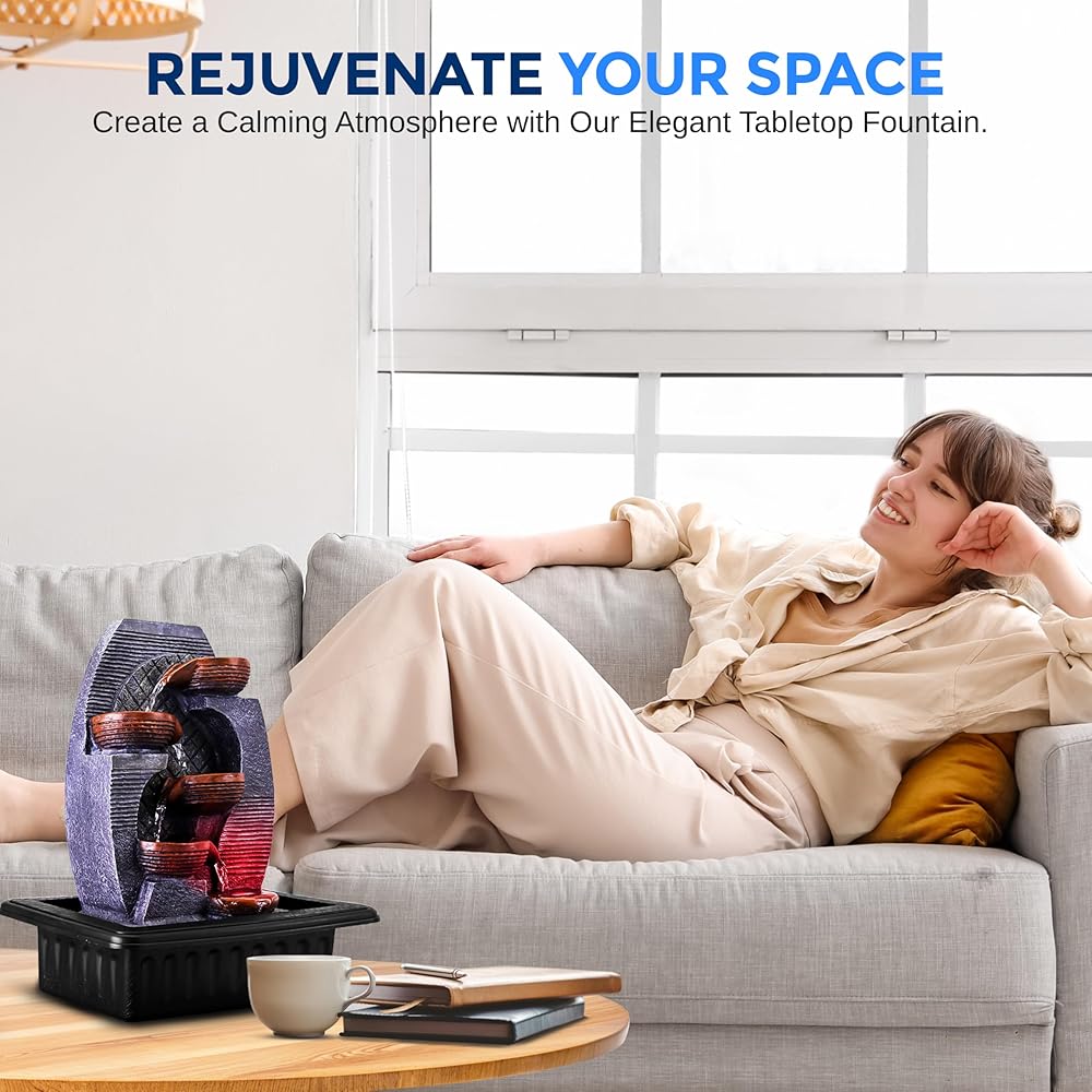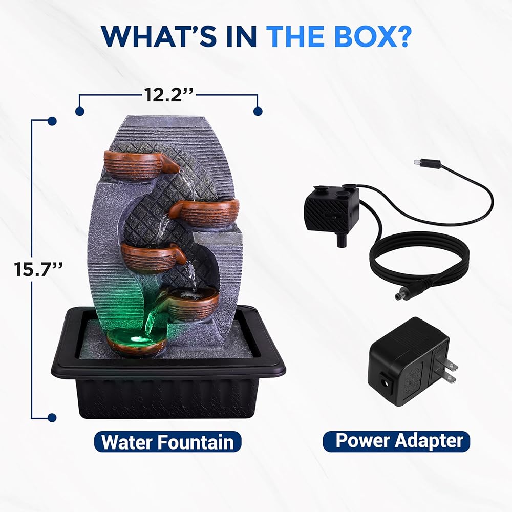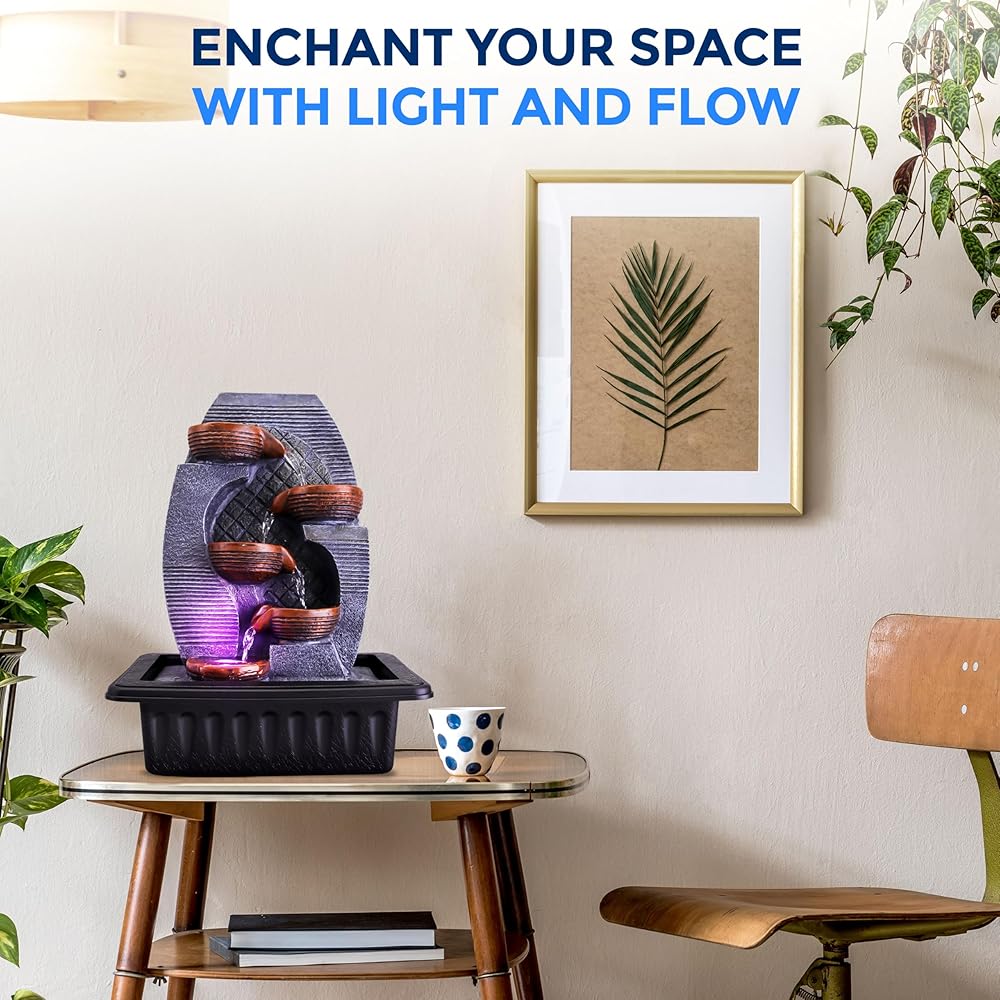 LIGHTS UP THE MOOD: This 4-tier relaxing table top fountain decoration has a subtle LED illuminated lighting effect that is really pleasing to the eye and that's sure to improve your comfort.