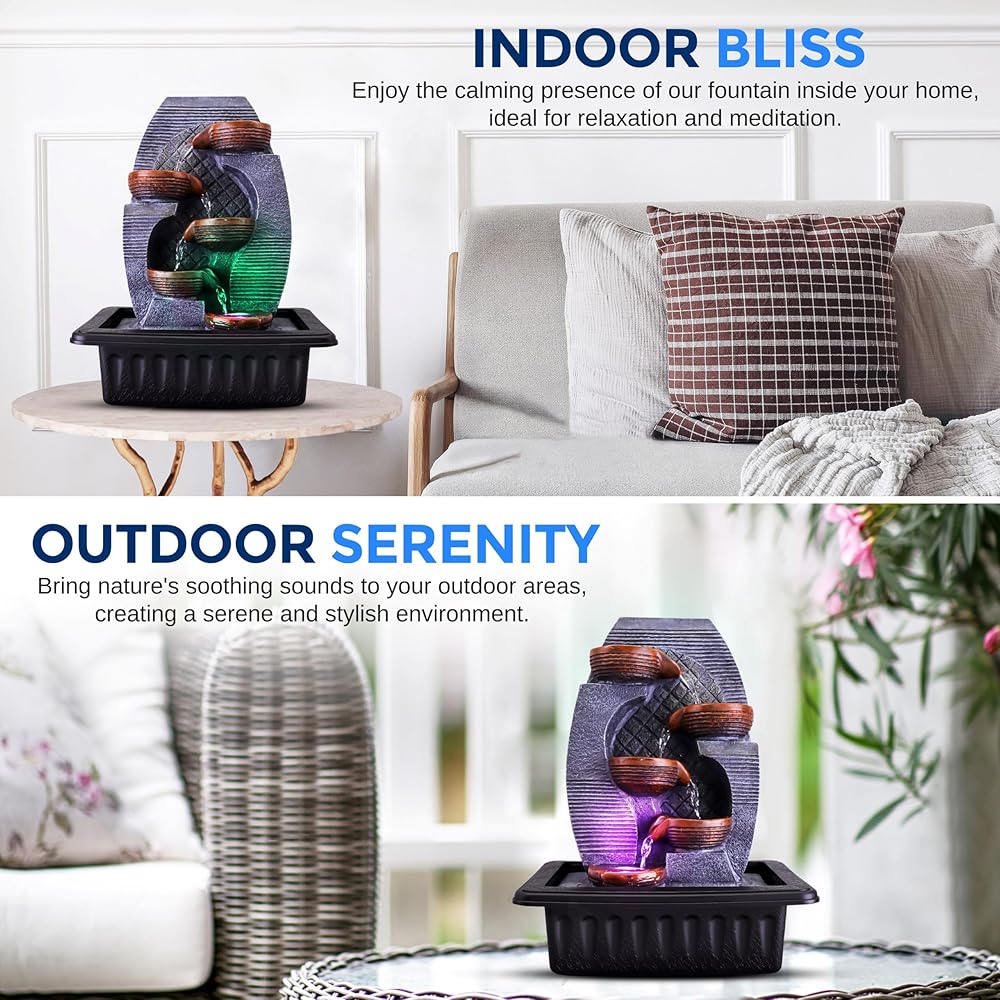 INDOOR & OUTDOOR SAFE: A versatile gardening and landscaping piece, this cool tiered desktop cascade LED fountain can be placed anywhere inside or outside your home. Perfect for your bedroom, garden or patio!