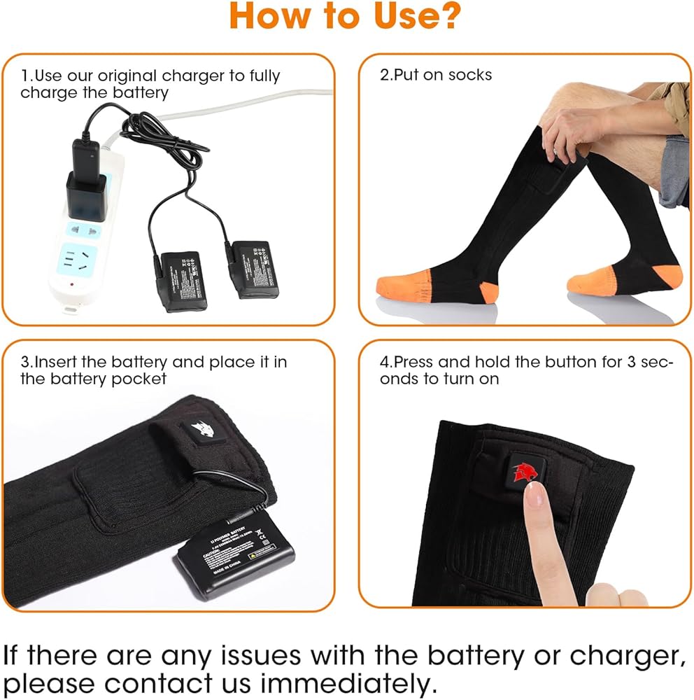 【Our After-Sales】: Our heated socks have 1 year quality assurance. If you have any questions about quality, please feel free to contact us and we will solve your problem quickly until you are satisfied.