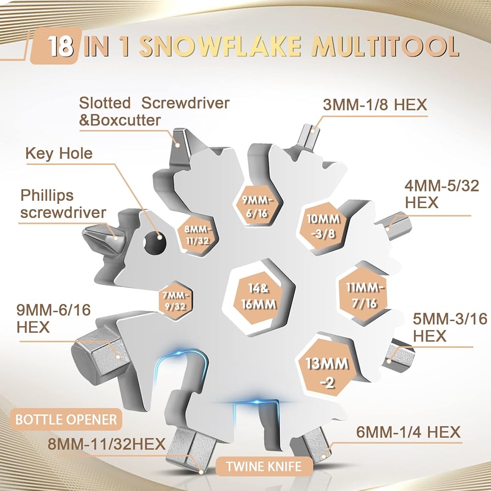 هدايا للرجال: 18 في 1 من الستانلس ستيل على شكل ندفات الثلج متعددة الأدوات صغيرة وعملية. يمكن استخدامها كهدايا جميلة لهدايا عيد الأب، هدايا عيد الحب، هدايا الكريسماس، هدايا عيد الشكر. إنها هدايا رائعة لعيد الأب من الابنة والابن والزوجة والأطفال.