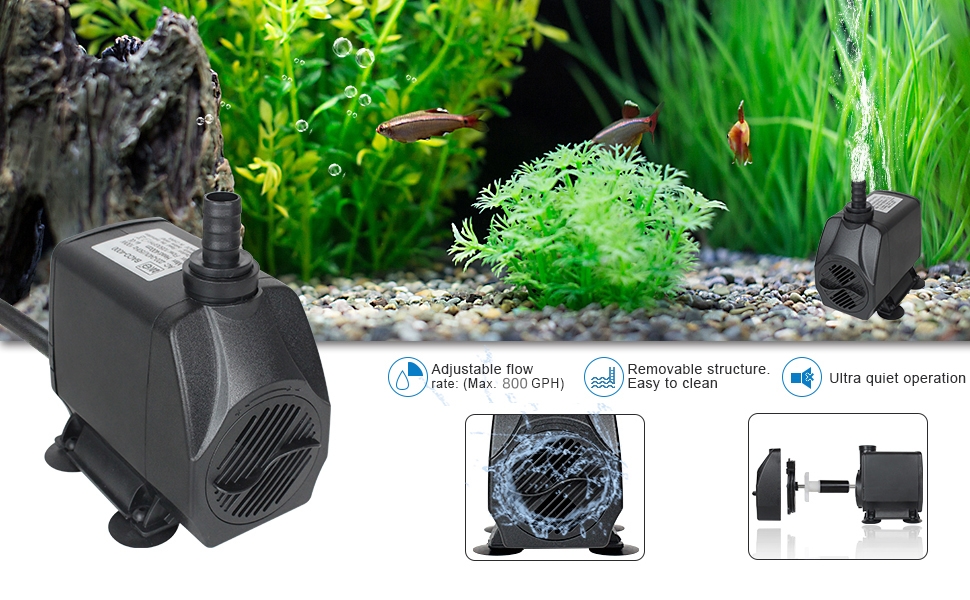 • ثلاث فوهات: مجهزة بـ 3 محولات للمنافذ، واحدة 1/2 بوصة، واحدة 5/8 بوصة، والأخرى 3/4 بوصة، مما يوفر تدفق مياه مختلف حسب رغبتك. هذه المضخة الغاطسة مثالية للمياه العذبة والمياه المالحة، ويمكن وضعها في حوض السمك والنوافير وخزان الأسماك والزراعة المائية والبركة.