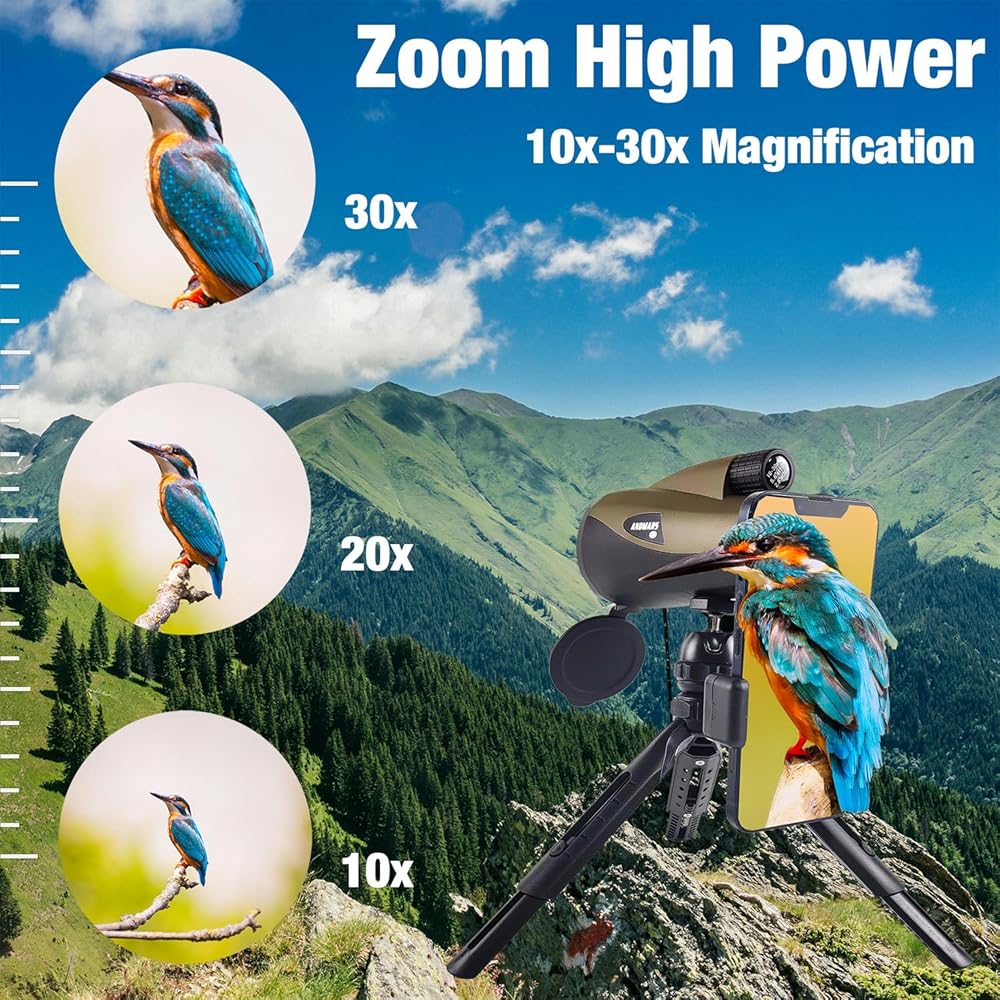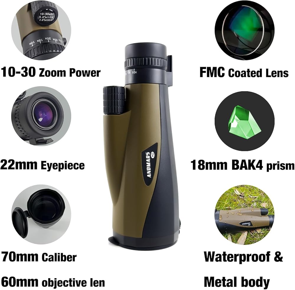 Andmars Zoom 10-30x60 منظار أحادي عالي الطاقة عالي الدقة للبالغين. تلسكوب مقاوم للماء مع حافظة جلدية وجسم معدني ومحول هاتف وحامل ثلاثي القوائم. FMC المغلفة ومنشور BAK4. لصيد الطيور والمشي لمسافات طويلة. (بني)