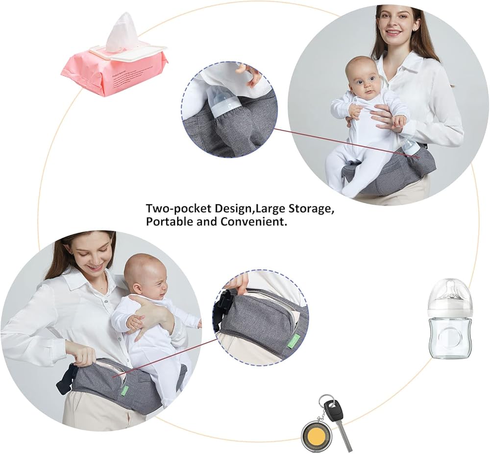 【تصميم تخزين كبير】: حامل الورك للأطفال الصغار مع جيب جانبي مناسب جدًا للآباء أثناء المشي بالخارج أو السفر. جيب جانبي كبير عملي يمكنه تخزين زجاجة الطفل لتلبية احتياجات الطفل وجيب جانبي آخر بسحاب يمكنه استيعاب المناديل أو المفاتيح أو الهاتف عند الحاجة.