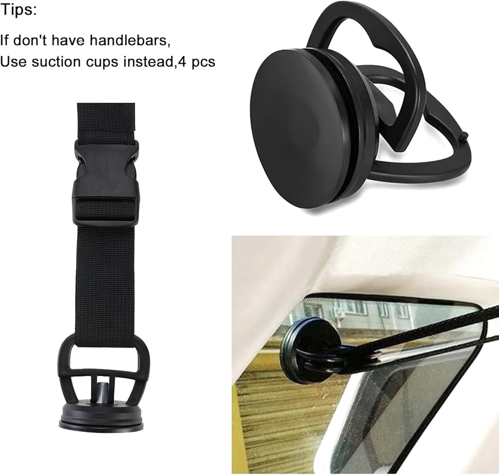 2. The fishing rod holders need 4 handlebars or hooks to install with, if you don't have enough bars or hooks, you can use the Suction Cups to secure the belt.