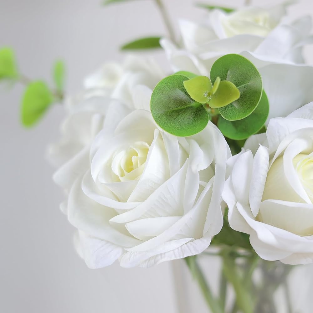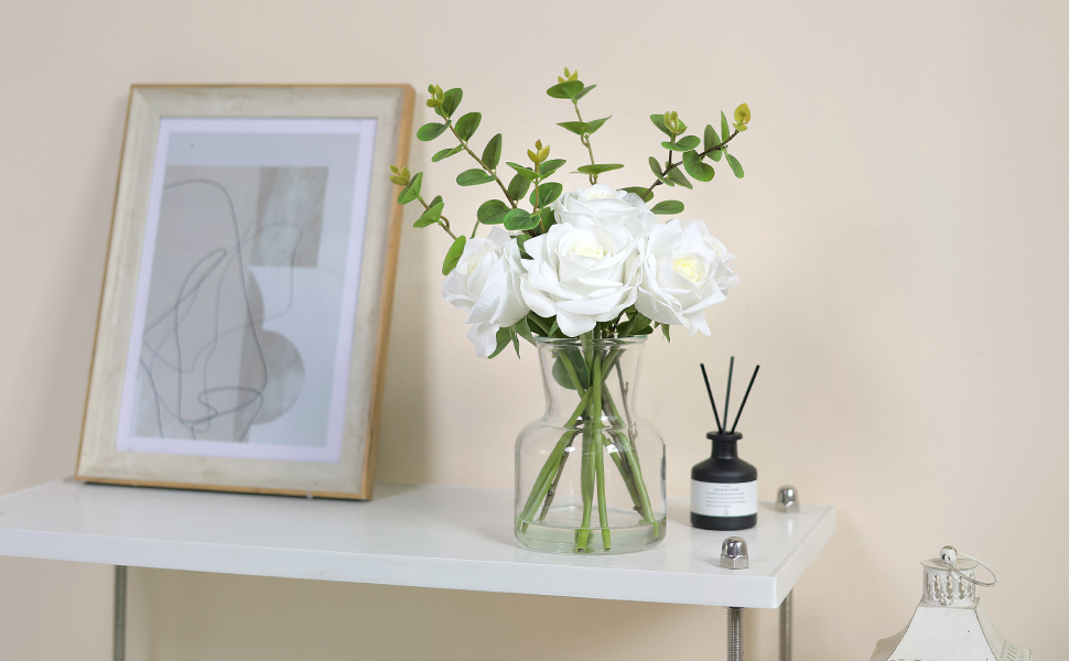 [ورود نابضة بالحياة]: 7 ورود حريرية بيضاء ذات ملمس حقيقي و5 أوكالبتوس بلمسة حقيقية مع مزهرية. تمت معالجة الورود الصناعية والأوكالبتوس خصيصًا لتشعر بالرطوبة مثل الزهور الطازجة. مزهرية زجاجية شفافة تحتوي على مياه صناعية واقعية مثبتة مع الباقة لمزج مثالي. المزيج الفريد يجعل ديكور منزلك يبدو أكثر تطوراً ورقياً.