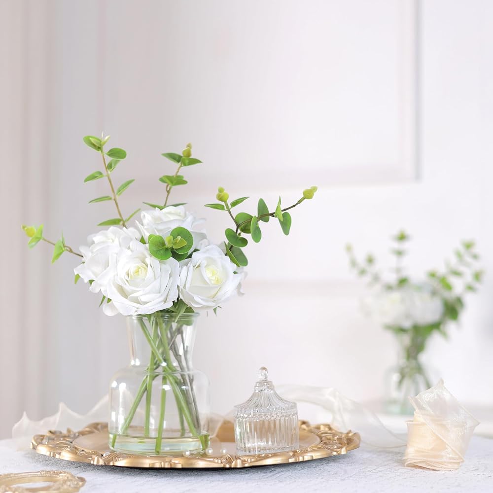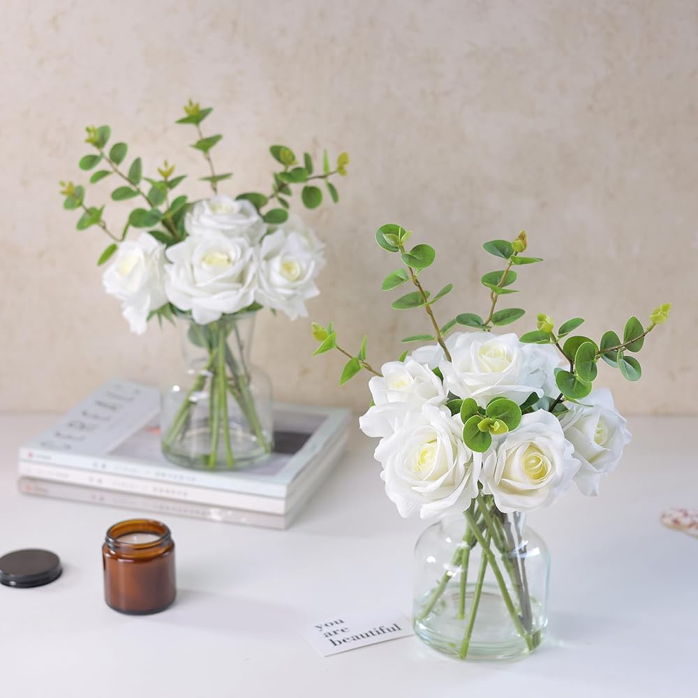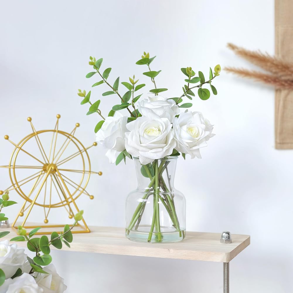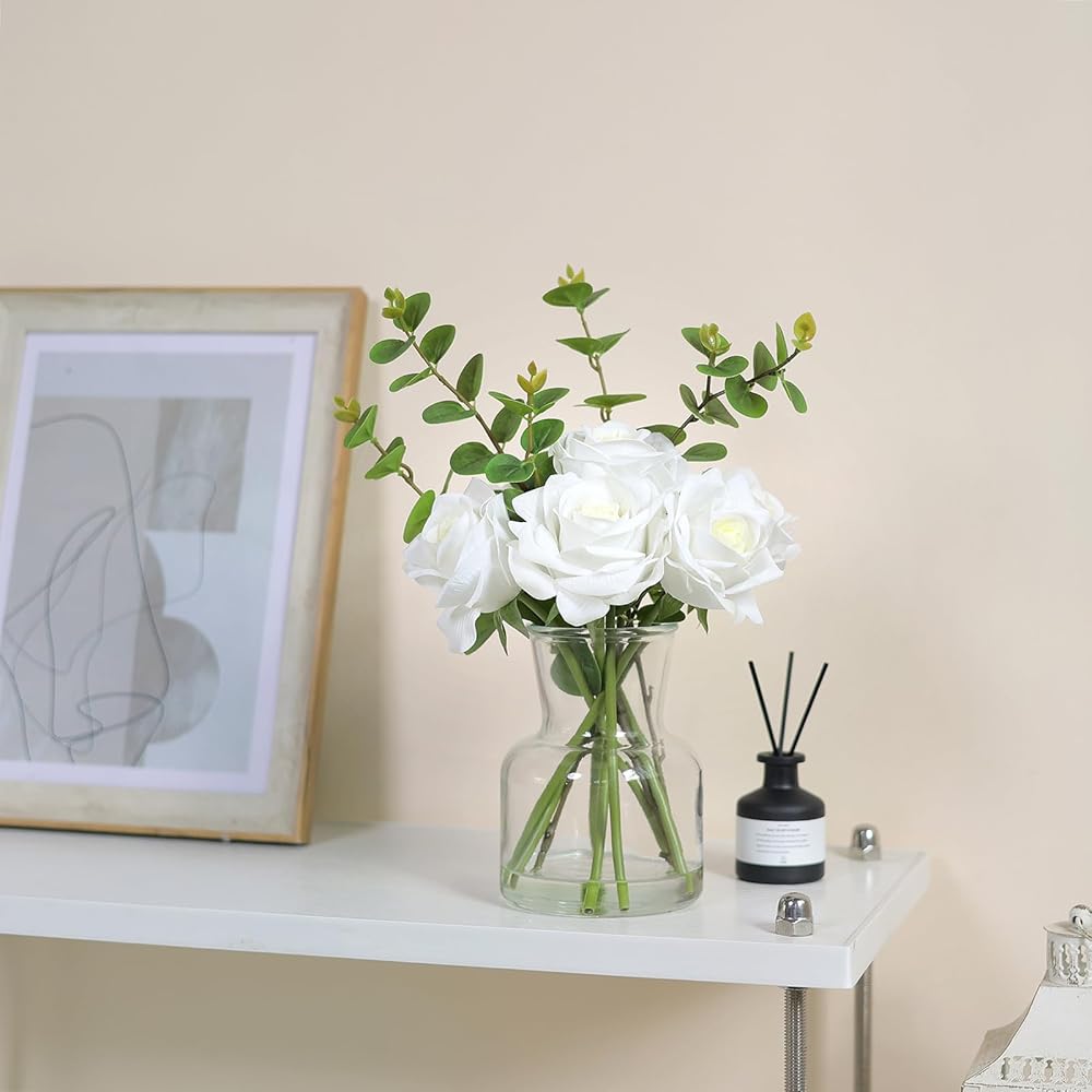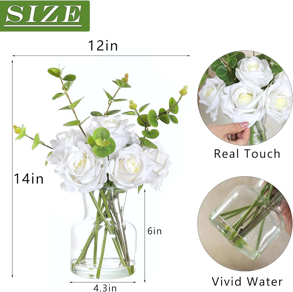 زهور صناعية بلمسة حقيقية مع ماء صناعي في مزهرية، ورود حريرية واوكالبتوس مع ترتيبات زهور مائية مزيفة في مزهرية زجاجية لتزيين الطاولة المركزية والمطابخ والمكتب وديكور المنزل (ابيض)