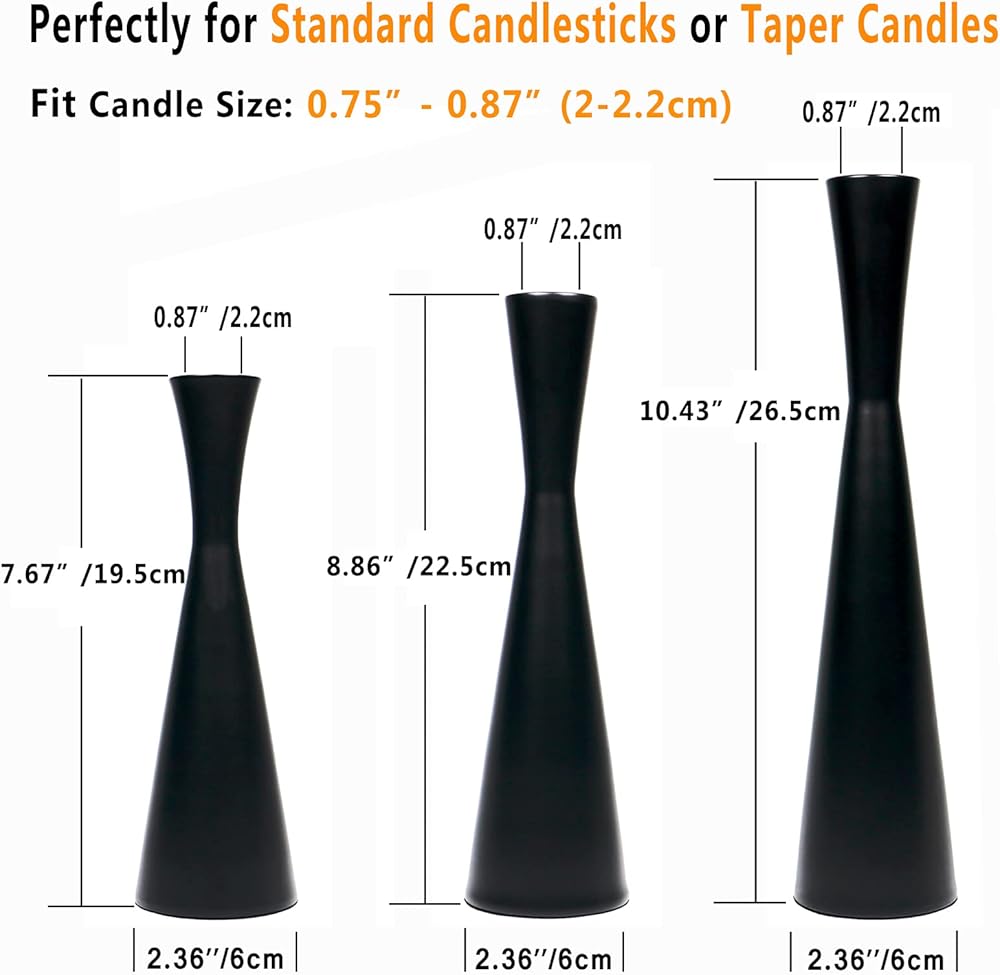 الأبعاد: عرض القاعدة 2.36 بوصة لجميع المقاسات. ثلاثة ارتفاعات: صغير- 7.5 بوصات؛ متوسط- 8.8 بوصات؛ كبير- 10.25 بوصة، حجم فتحة الشمعة: 0.78 بوصة D- 1"D (حجم شمعدان/مستدق قياسي). مناسب تمامًا لأي شمعة قياسية أو شموع مستقطة. العبوة - 3 قطع حامل شموع. حامل الشموع فقط، الشموع غير متضمنة