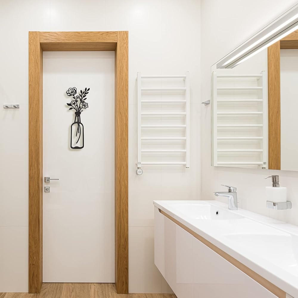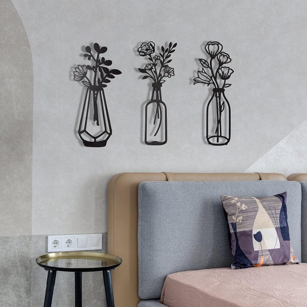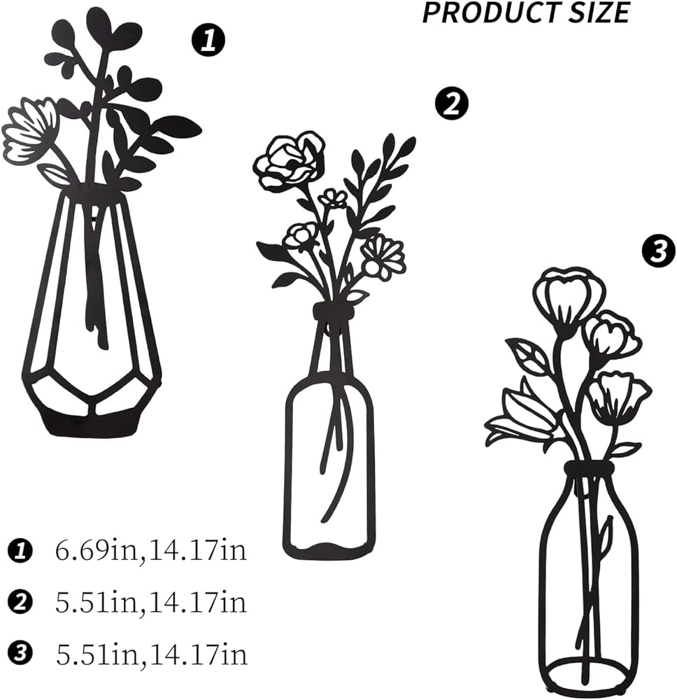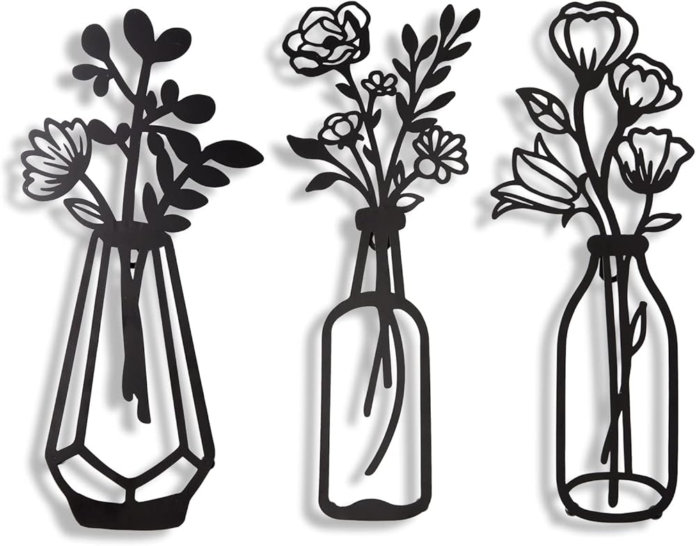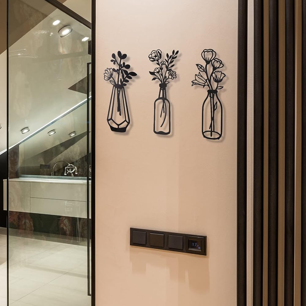 3 قطع من زهور معدنية لتزيين الحائط، مزهرية معدنية بنمط زهور، فنون حائط معدنية ذات طابع طبيعي، ديكور حائط معدني بسيط على شكل زهرة معدنية سوداء لديكور الحائط للمنزل/الحمام/ديكور حائط المطبخ