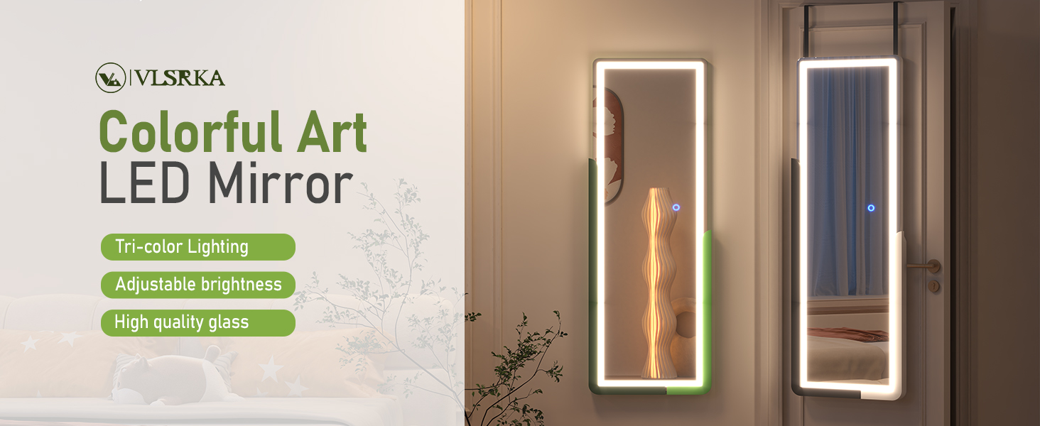 【سطوع قابل للتعديل 3 ألوان أضواء】مرآة الباب LED من Vlsrka متوفرة بثلاثة ألوان فاتحة: الضوء الأبيض (6500K)، الضوء المحايد (4000K)، الضوء الدافئ (3000K). ما عليك سوى لمس الزر الدائري للتبديل بينهما، والضغط لفترة طويلة لضبط سطوع الضوء.