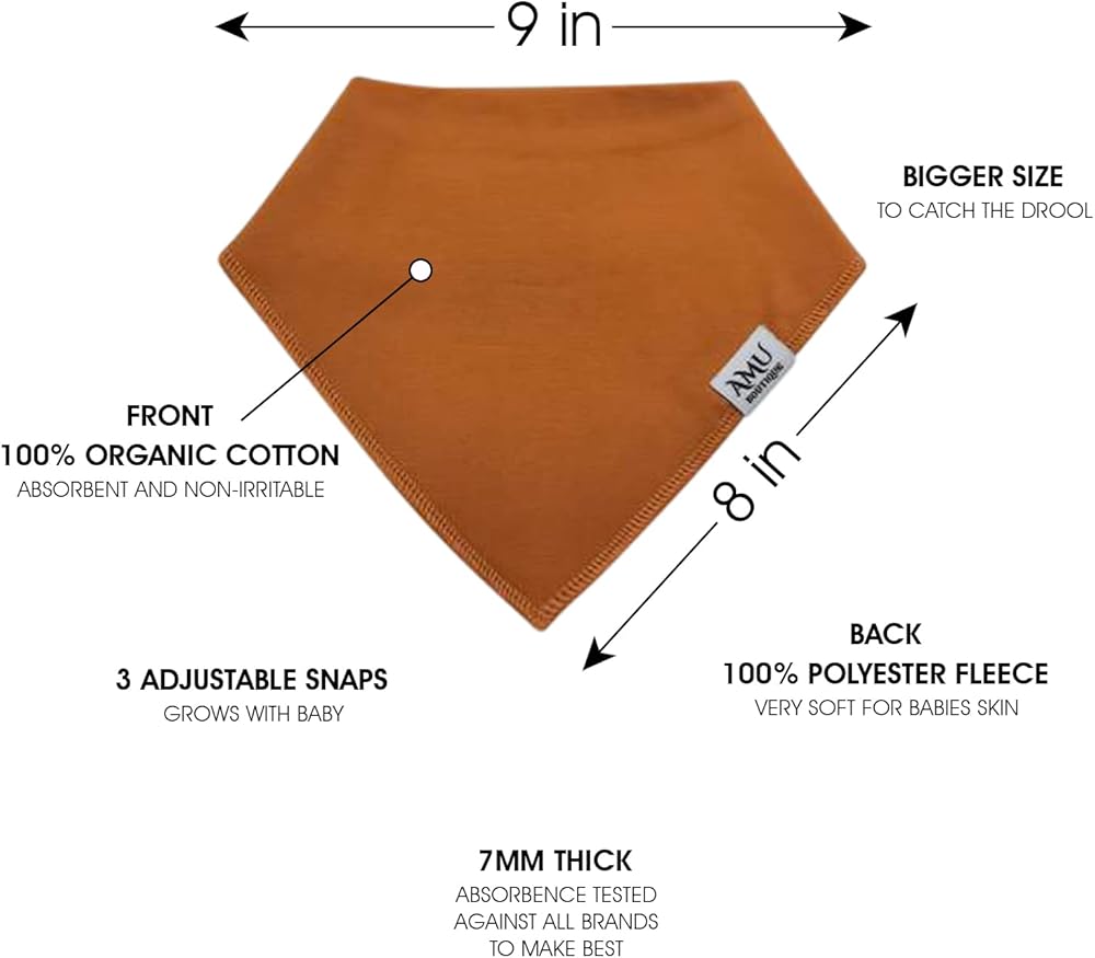 Soft Drool Bibs: Our fashionable baby bandana drool bibs are made of polyester on the back for additional absorbency and soft organic cotton on the front for extra comfort. Our fleece-backed baby burp bibs and teething bibs for boys and girls keep garments dry from copious amounts of drool. Drool covered clothing is kept dry by wearing bibs. The fabric's quality is crucial, as are the vibrant colors that don't have a chemical scent and maintain their shape and color after washing.