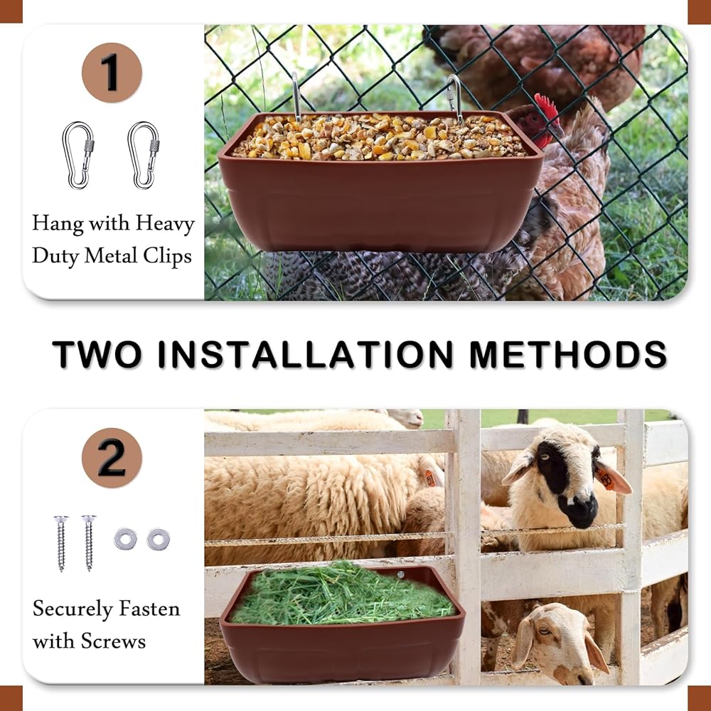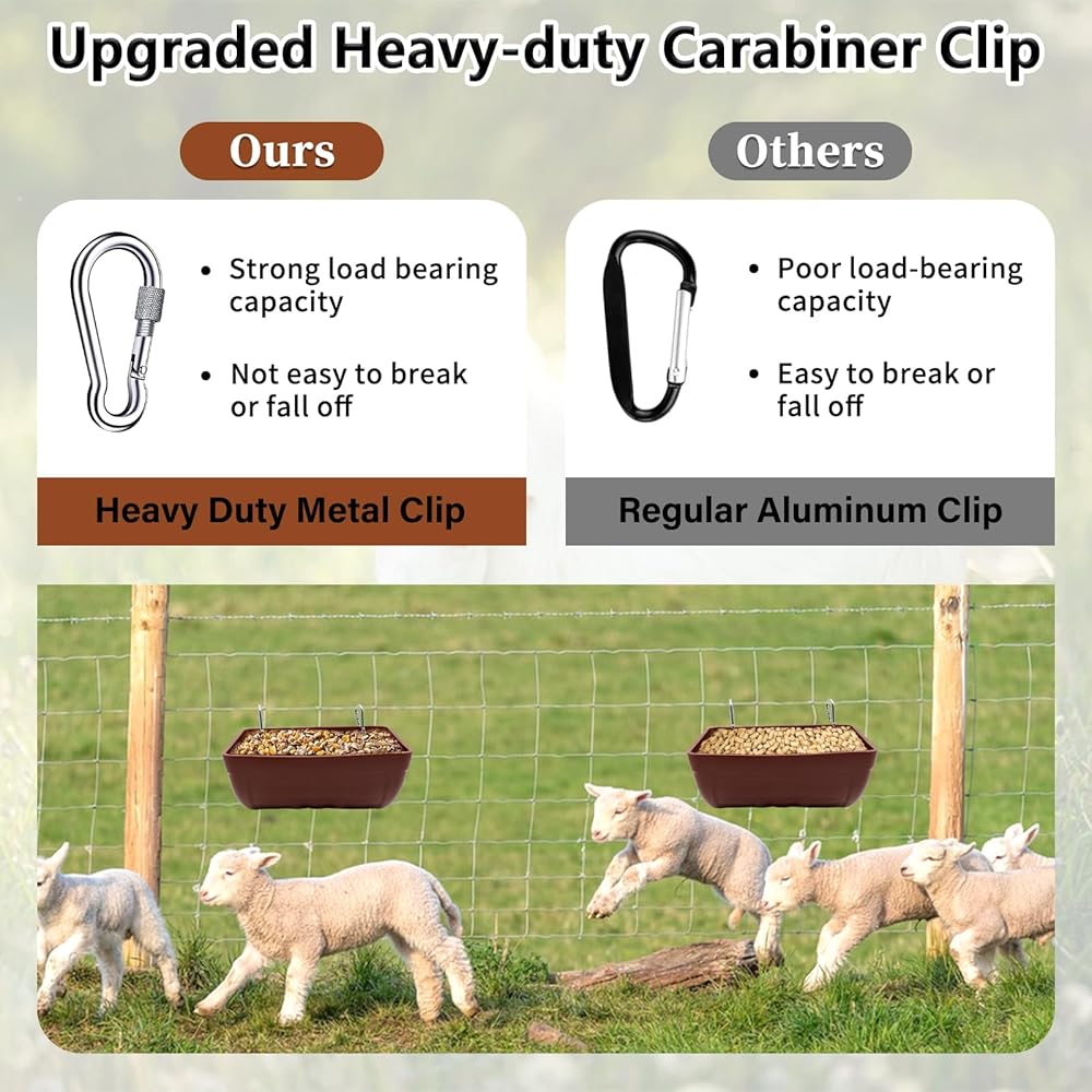 🐐【مواد متينة وآمنة】دلو حوض التغذية مصنوع من مواد بلاستيكية سميكة آمنة، قوية ومتينة، وخالية من مادة BPA، وتضمن سلامة الغذاء والماء للماشية. من خلال أبحاث السوق، يأتي مع 4 مشابك تثبيت شديدة التحمل لزيادة قدرة التحمل. إكسسوارات حظيرة الدجاج العملية للغاية، لا يمكن كسرها بسهولة، ويمكن أن تدوم لعدة سنوات في الخارج.