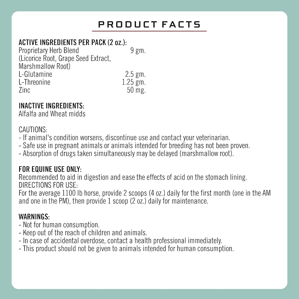 تعزيز صحة الجهاز الهضمي - وخاصة في الخيول المتوقفة أو التي تتغذى على الحبوب - مع الدعم الطبيعي لتخفيف آثار الحمض على بطانة المعدة.