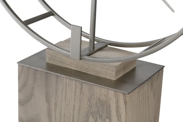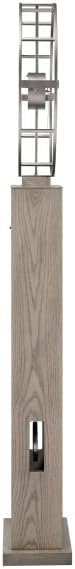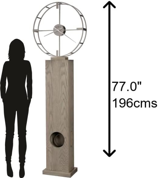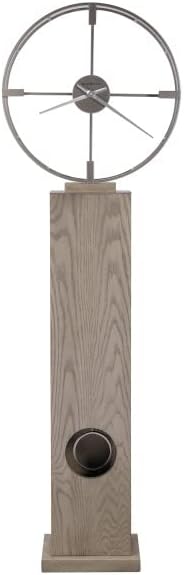 The Bancroft Floor Clock by Howard Miller has a Seaside Grey finish. 94th Anniversary Edition. Wooden base pilin capped with satin nickel finished plate and cutouts for oscillating pendulum. 24-inch metal dial with suspended hour markers and hour and minute hands in satin nickel. Illuminated dial and case with roller switch. Adjustable floor levelers. Made in the USA.