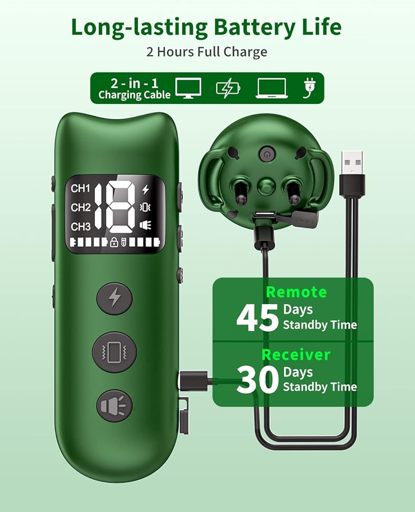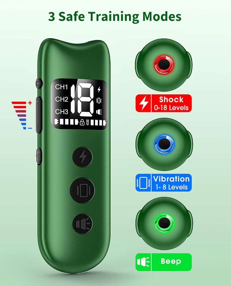 3 أوضاع للسلامة - يحتوي الطوق الكهربائي على 3 أوضاع تدريب: صفير/اهتزاز/صدمة ثابتة، ويمكنه عرض ألوان LED ذات الصلة على جهاز الاستقبال. لذلك يمكنها إيقاف نباح/قتال الكلاب وما إلى ذلك. سلامة وفعالية وساحرة.