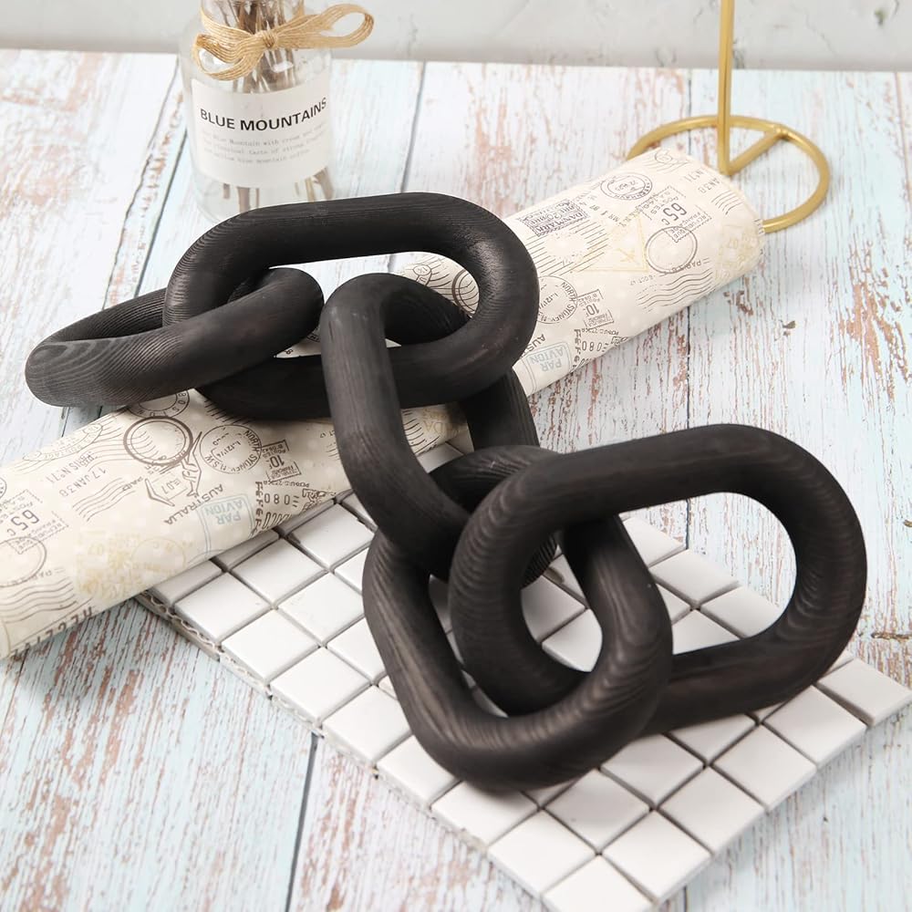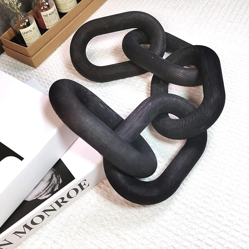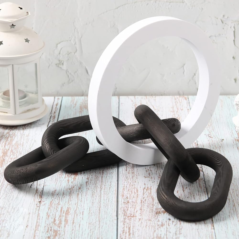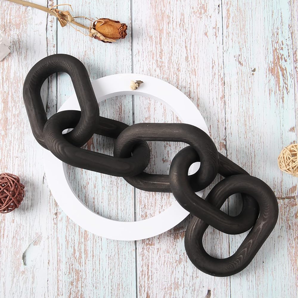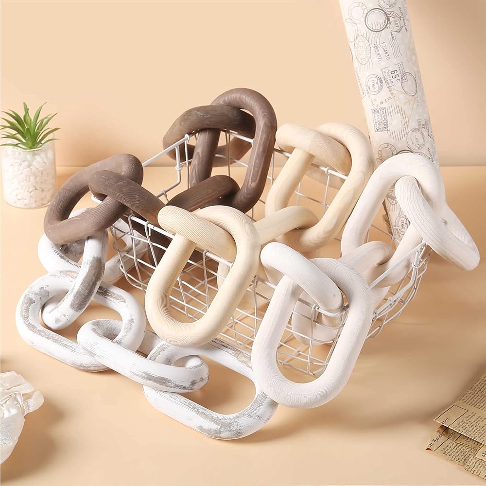 Product description: Wood Chain Link Décor Rustic White Washed Decorative Chain, Great as Coffee Table Decor or Shelf Decor, Made from Pine Wood, Matches Well with Farmhouse, Boho, Country or Modern Home Décor Wood Chain Link Decor Modern Decorative Wood Chain Link 5 Link Pine Wood Knot Boho Decorations