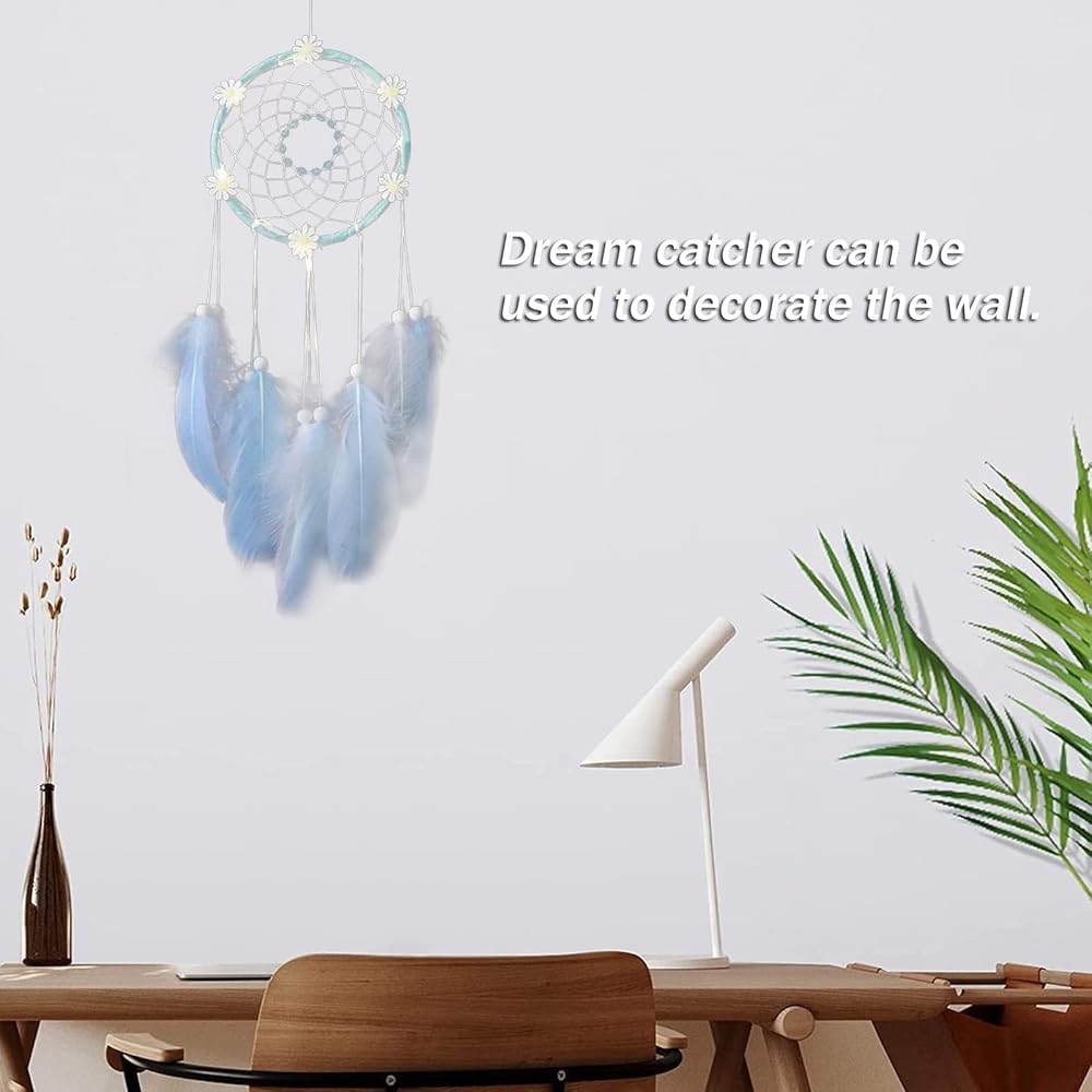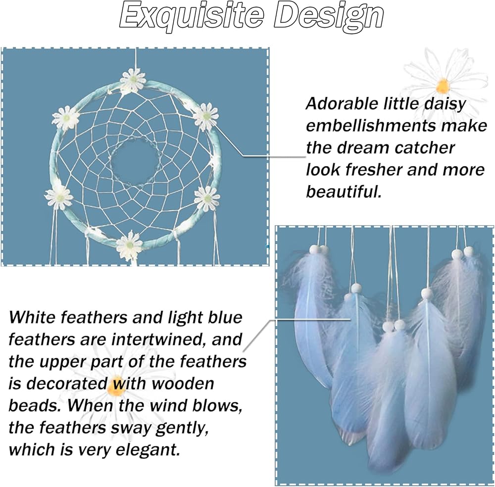 ☀ تصميم رائع: على عكس صائد الأحلام الأخرى التي تباع كمنتج نهائي، يحتاج صائد الأحلام هذا إلى إبداعك وقدرتك العملية على التجميع. عند الانتهاء من تجميع صائدة الأحلام، سيتم عرض الجمال بالكامل، وتنتشر أزهار الأقحوان الجميلة حول الدائرة، ويرقص الريش الأزرق مع الريح.