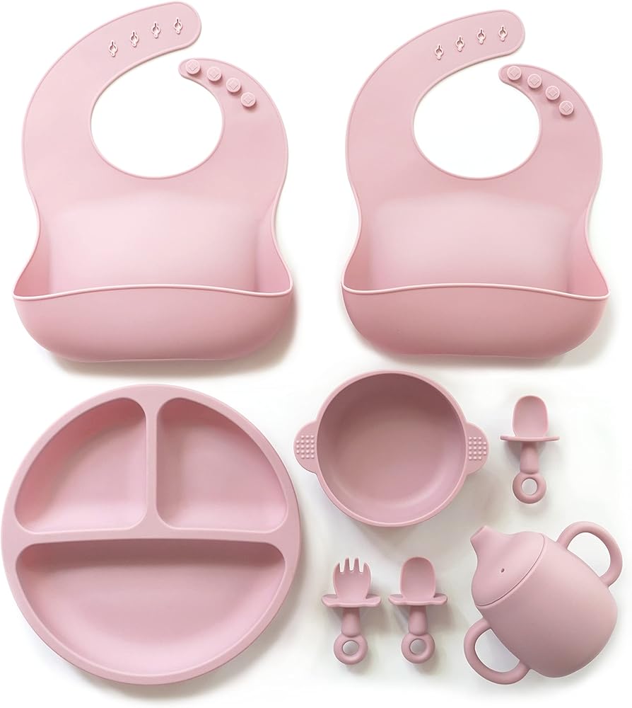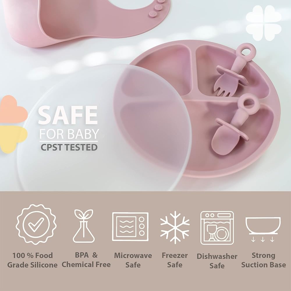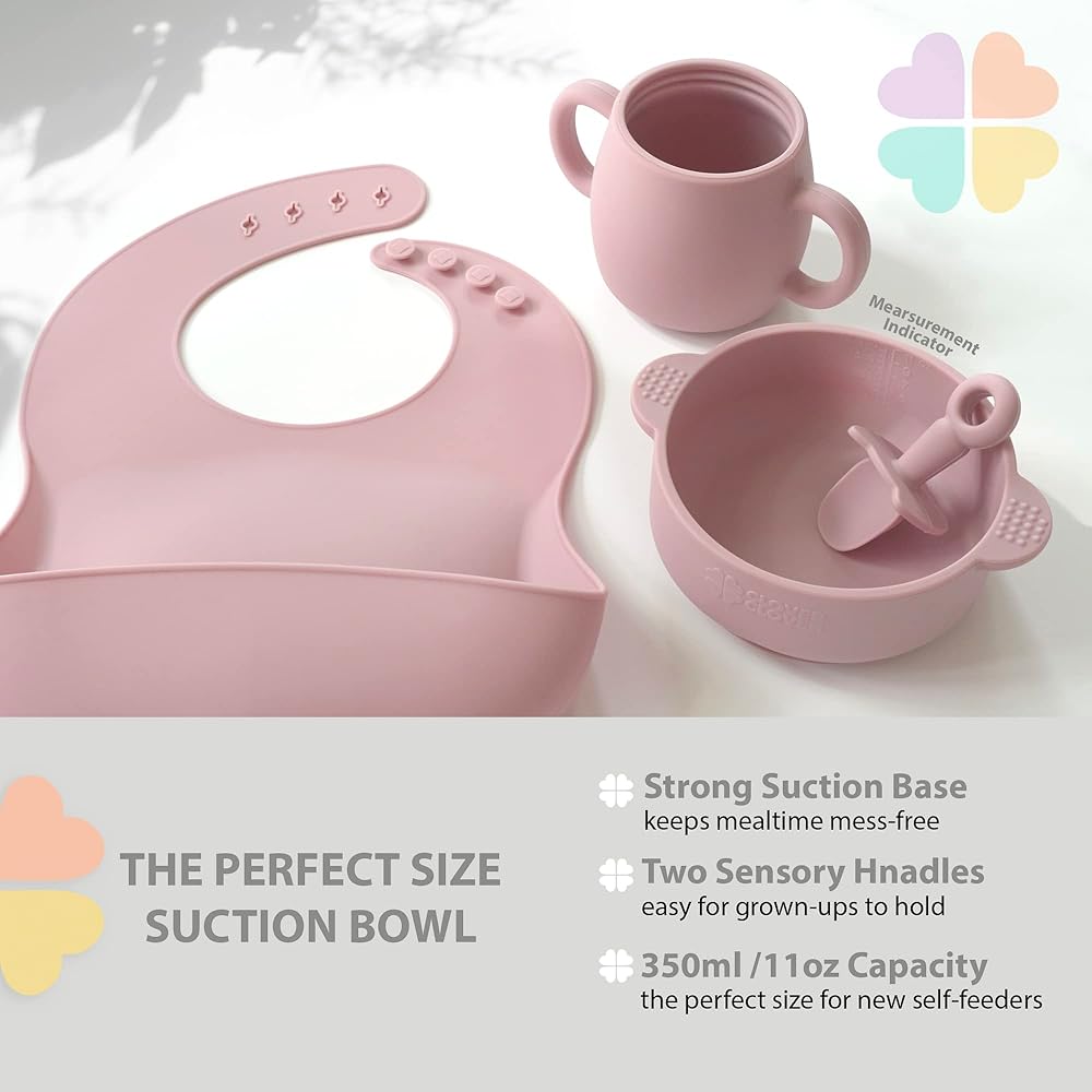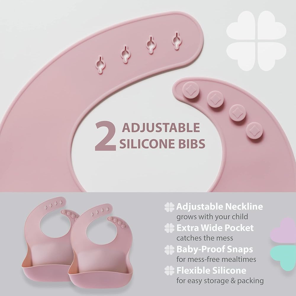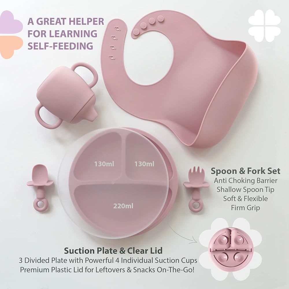 مجموعة مستلزمات الفطام للأطفال من كلوفر كلوفر، 9 قطع - مجموعة تغذية الأطفال الصغار - طبق شفط مقسم من السيليكون مع غطاء، وعاء شفط، كوب سيبي، 2 مريلة، 2 ملعقة ناعمة وشوكة 6 أشهر فما فوق (وردي غير لامع)