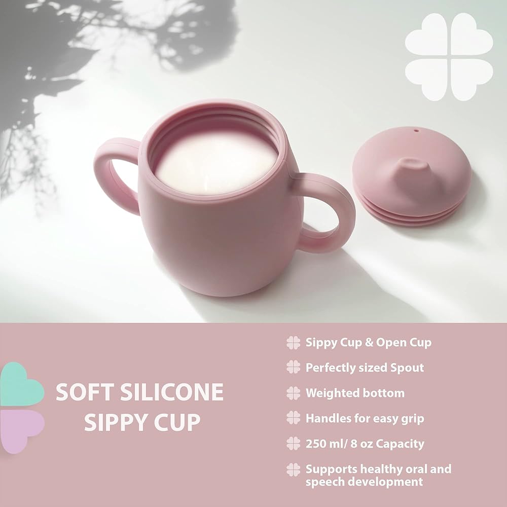 BABY TRAINING SIPPY CUP: The cup has two soft and strong handles that your baby can easily and comfortably grip. If the cup is dropped, it will not break or hurt your baby's skin. It is designed to be gentle on baby gums and toddler teeth while drinking. It holds approximately 8 oz /250 ml of liquid. As your baby transitions from bottles to cups, this sippy cup helps in the development of fine motor skills and independent eating habits.These spill-proof toddler cup can be used as a sippy cup as well as a children's open cup without a lid.