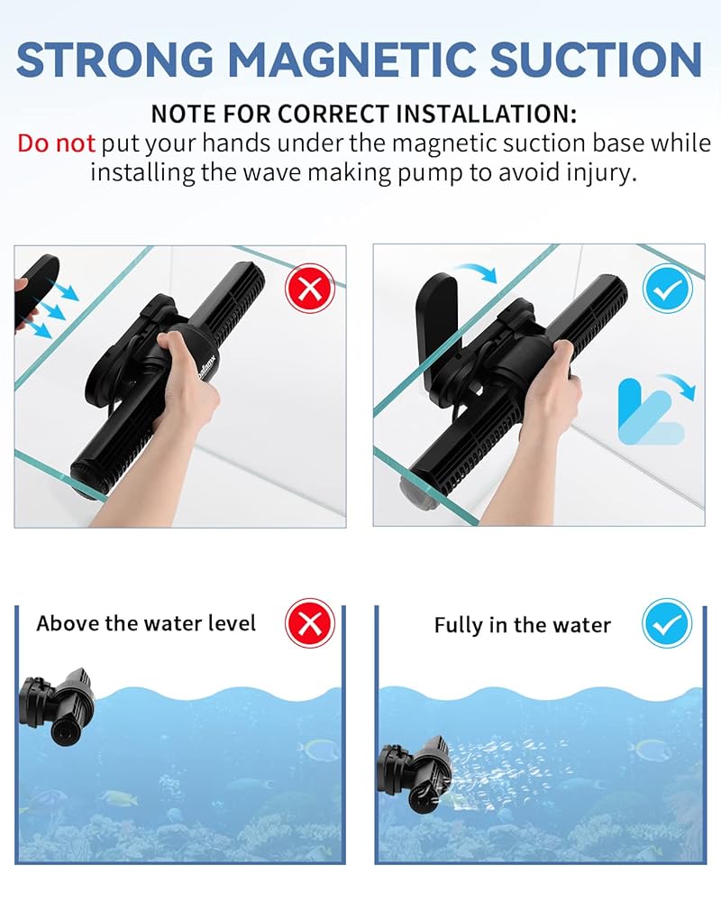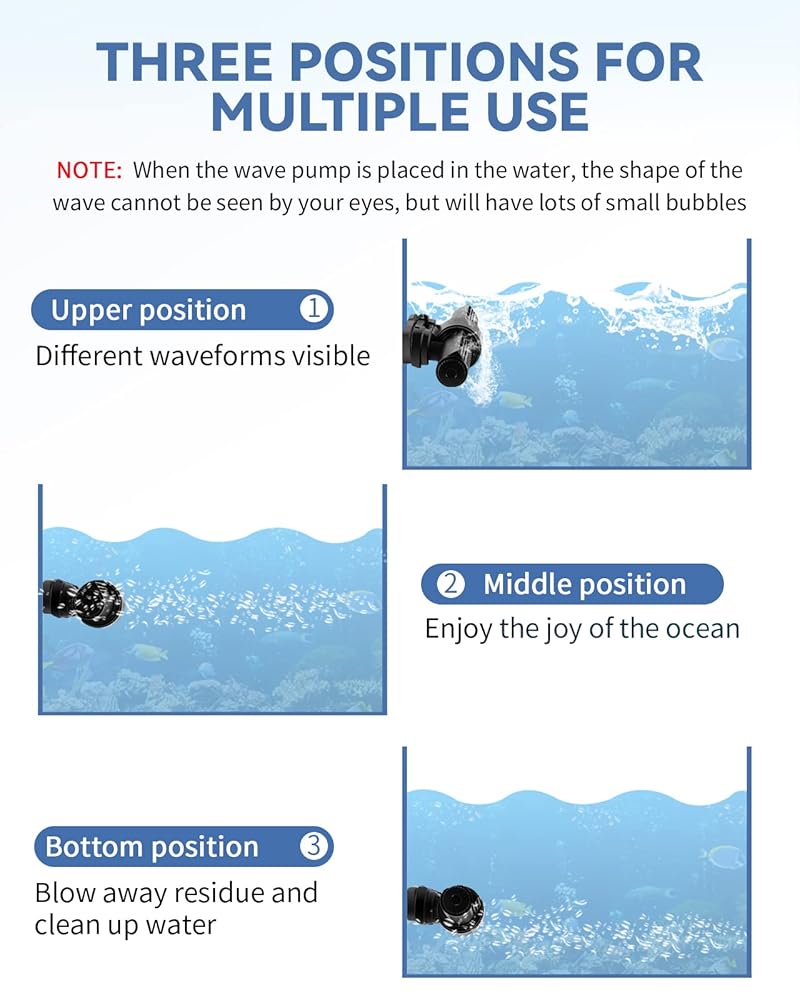 [3 أوضاع حسب الطلب] يتم تركيبها على الجانب العلوي من خزان الأسماك، يمكنك رؤية الشكل الواضح للموجة. يتم تركيبه في منتصف الخزان، ويمكنه محاكاة تأثير المحيط الحقيقي. يتم تركيبه في الجزء السفلي من الخزان، ويمكنه نفخ الحطام الموجود في الأسفل، وإزالة المياه الراكدة والحفاظ على الخزان نظيفًا.