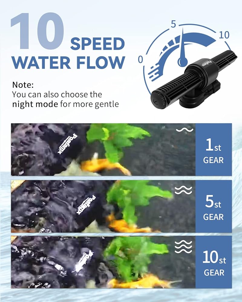 [وحدة تحكم LED ذكية] يأتي صانع موجات حوض السمك مع وحدة تحكم LED، ويمكن تعديل 7 أنواع مختلفة من التدفق لمحاكاة بيئة المعيشة الطبيعية، مما يجعل مخلوقاتك المائية مليئة بالطاقة. وضع الفجوة، وضع التيار المستمر، وضع المد والجزر، وضع الاضطراب، وضع الدورة الدموية، وضع الربط والوضع الليلي.