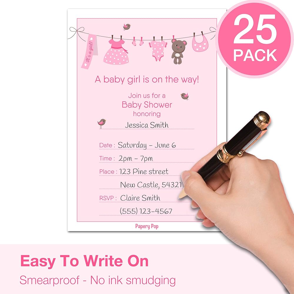 أبهر ضيوفك بهذه المجموعة الجميلة المكونة من 25 دعوة ومغلفات وتذاكر سحب الحفاضات والكتب لبطاقات طلب استقبال المولود. تتميز دعوات استقبال المولود للفتيات بنمط بطاقة بريدية (غير قابلة للطي) وتأتي مع مظاريف بريدية بيضاء (مقاس ايه 7) مصنوعة من ورق ممتاز. البطاقات مطبوعة على بطاقات غير لامعة ثقيلة الوزن ويمكن الكتابة عليها بأي قلم رصاص أو قلم دون تلطيخ. إنها أحادية الجانب وتأتي بنمط خط ملابس رائع سيحبه ضيوفك تمامًا. لا تأتي فقط بألوان غنية نابضة بالحياة ولكنها سميكة، مما يجعلها أكثر متانة. تصميم محمي بحقوق الطبع والنشر مسجل بواسطة بيبري بوب.