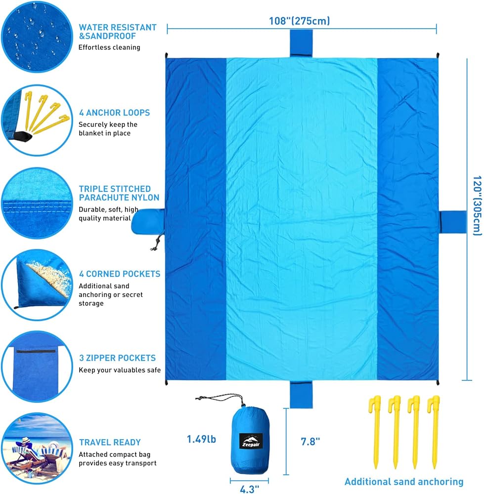 تصميم مريح: تتضمن بطانية النزهة الخارجية للشاطئ فائقة الصغر من Zeepair 4 أوتاد أرضية، و4 جيوب رملية في الزوايا، و3 جيوب بسحاب، و1 كيس ضغط مرفق. إنها مخيطة ثلاثية للحصول على قوة ومتانة فائقة. يمكن غسل سجادة الشاطئ هذه في الغسالة وتجفيفها بسرعة، وسهلة التنظيف للغاية. تأتي مع حقيبة ضغط لن تضيع. استمتع بعطلة صيفية على الشاطئ بمزيد من الراحة ومتاعب أقل. إذا كان لديك أي أسئلة، فلا تتردد في الاتصال بنا.