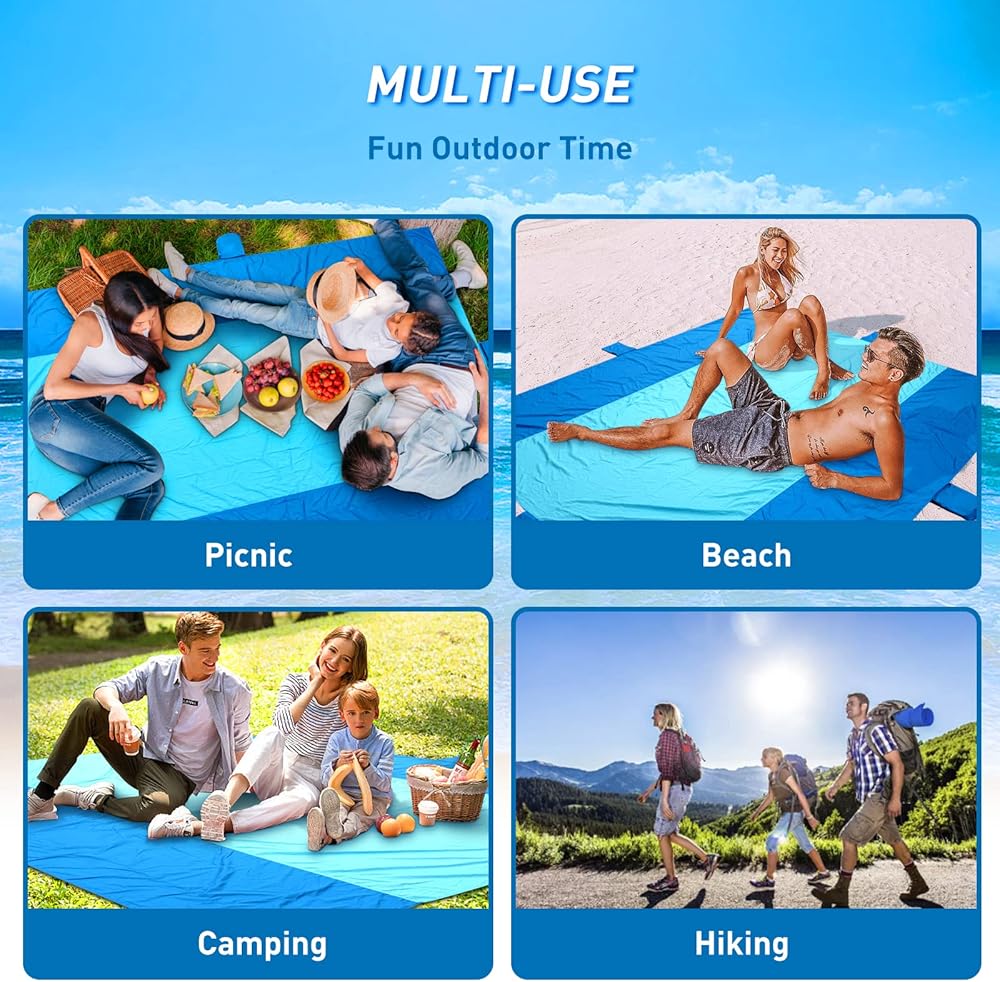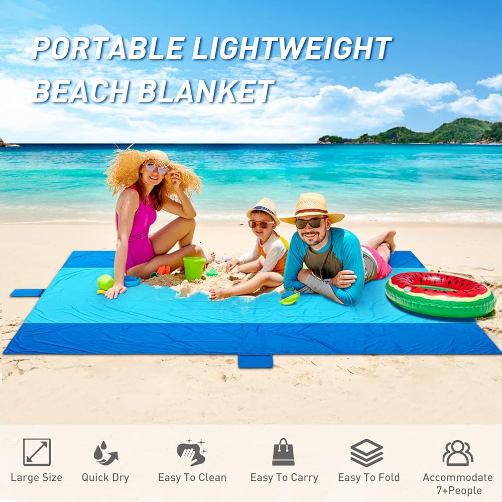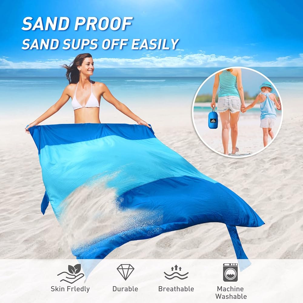 مقاومة للماء والرمل: بطانية الشاطئ الخالية من الرمال الخاصة بنا مصنوعة من نايلون المظلة الفاخر المقاوم للتمزق، وهو مقاوم للماء والرمل وقوي ومتين وخفيف الوزن وجيد التهوية. لن يلتصق الرمل ببطانيات الشاطئ، فقط قم بهز البطانية للتخلص من الرمال بسهولة. مقاوم للماء قوي، سهل التنظيف، سريع الجفاف بعد البلل. تتيح لك الأقمشة الناعمة المقاومة للحرارة والأوساخ الاستلقاء بشكل مريح على الشاطئ طوال اليوم