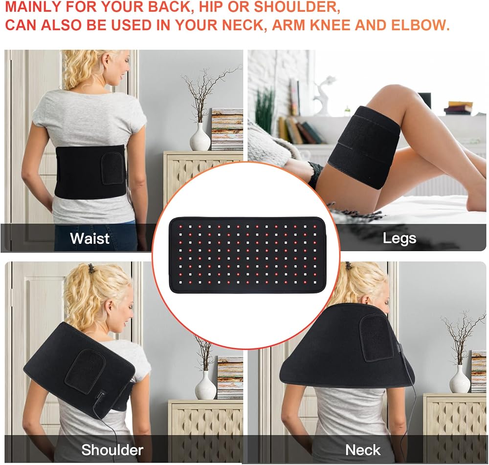 منطقة تغطية 15.7 انش × 7.9 انش وحوالي 13 واط مصابيح ليد قوية: إجمالي 120 مصباح ليد، كومبو 60 قطعة من الضوء الأحمر العميق (660 نانومتر) و60 قطعة من مصابيح الأشعة تحت الحمراء غير المرئية (850 نانومتر)، تخترق بعمق في الأنسجة. حزام سيرفري LED بالأشعة تحت الحمراء قابل للارتداء ويتكون من حزام قطني قابل للتعديل 2 في 1.