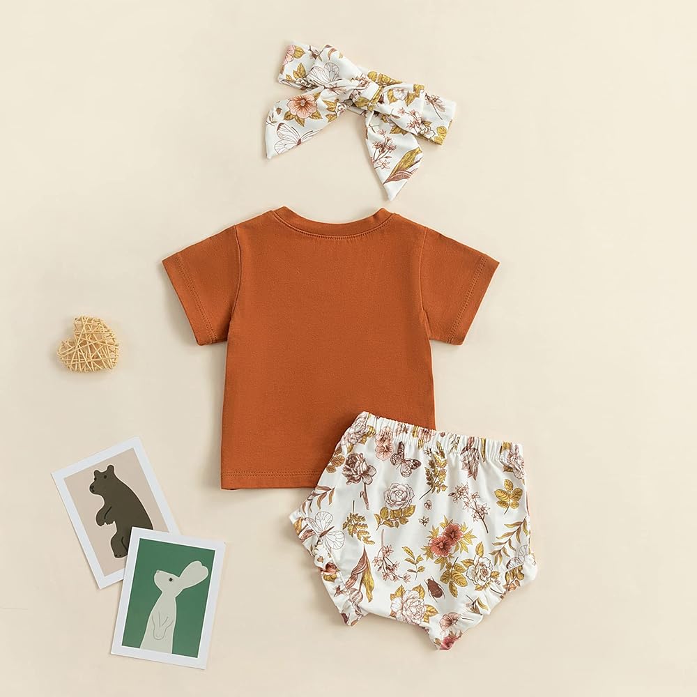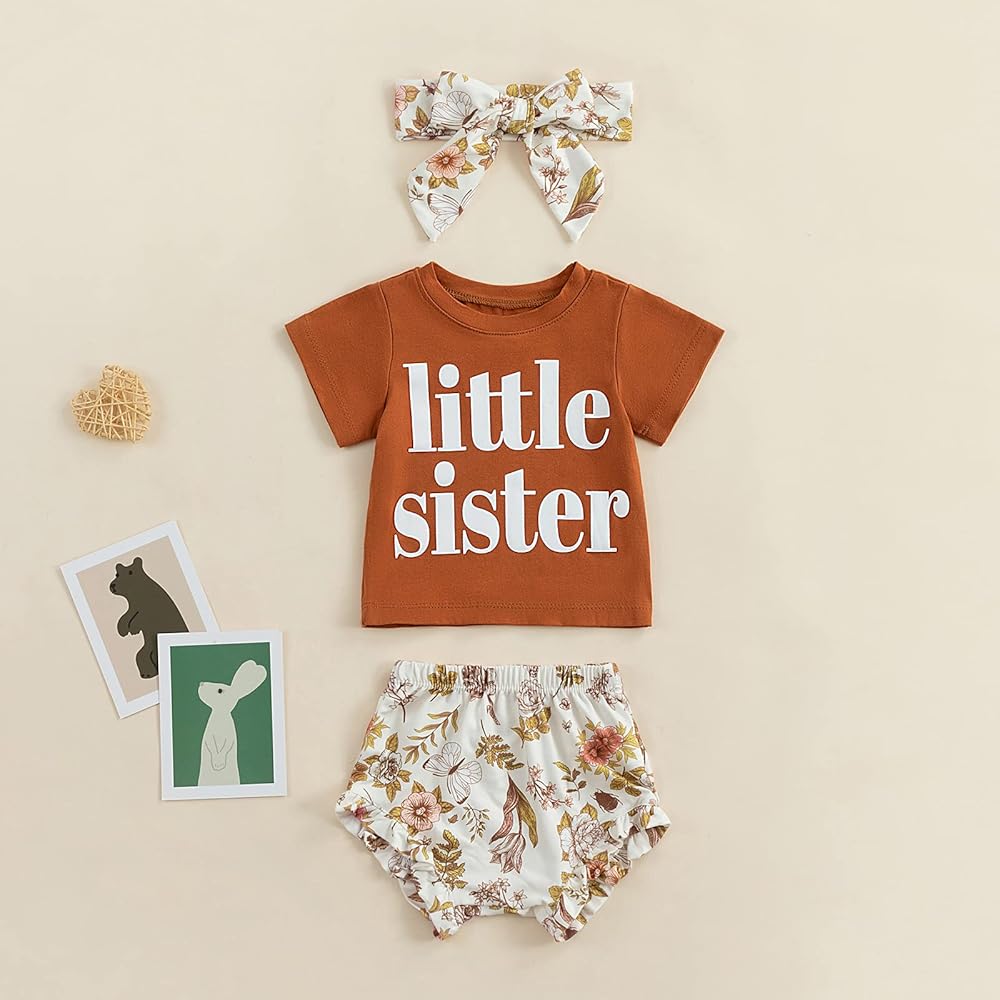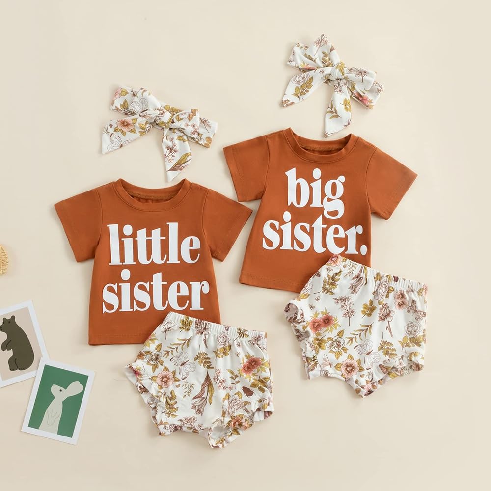 Design: 3 Pcs baby girl summer clothes set with unique and simple design ,baby girl letter t shirt top printed with“Big sister, Little sister”match with ruffles floral elastic waist bloomers shorts pants chic and stylish, there is cute headband as decoration for baby girl ,sweet and fashionable. Make your little princess more adorable and eye-catching, standing out in the crowd.