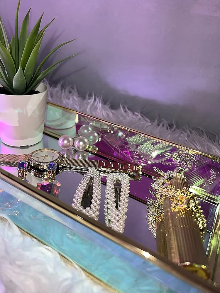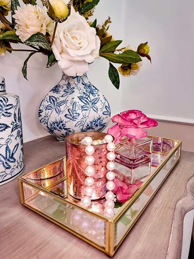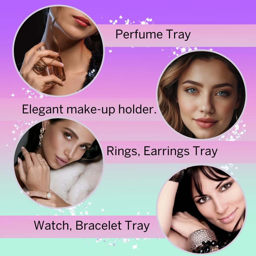 ديكور صينية إكسسوارات فانيتي: تستخدم لتخزين العناصر مثل العطور وأحمر الشفاه والمفاتيح والزيوت العطرية واللوشن والأمصال والكريمات والخاتم والأقراط وكريم الأساس والمكياج وغيرها.