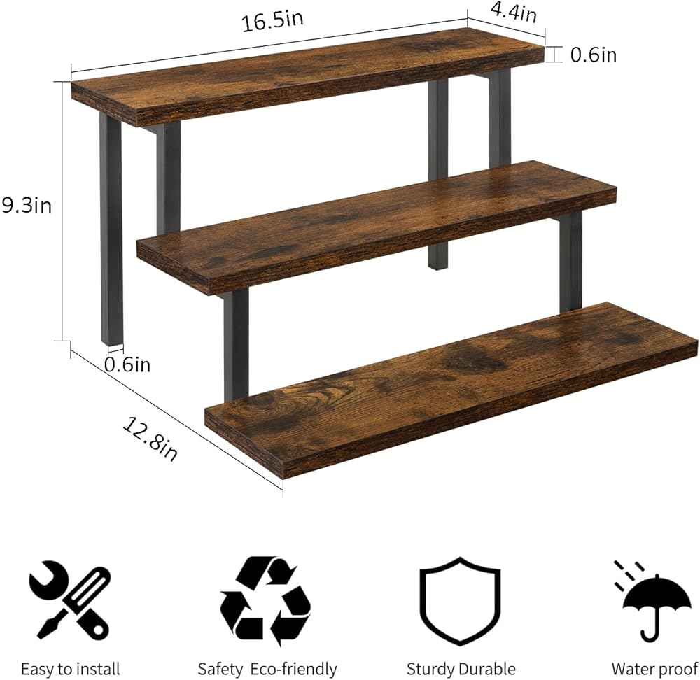 Quick Setup & Easy Cleaning: You can have this 3-tier display riser stand assembled in 10 minutes with detailed instructions and tools. The wooden surface is waterproof and dust-free; a damp cloth could keep the counter shelf clean. (Assembly tools and accessories are included in the package)