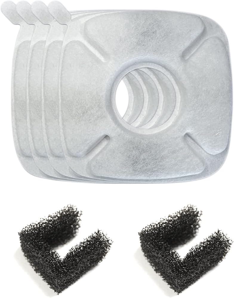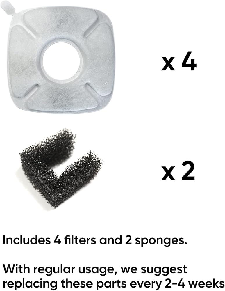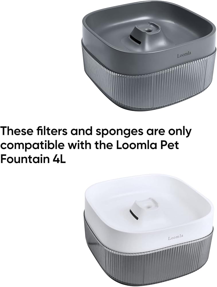 Compatible with Loomla 4L Capacity water fountain Pack Includes: 4 Pack Replacement Filters & 2 Pack Replacement Pre-Filter Sponges It is recommended to flush the filter and sponge with water every time you change the water, and they should be replaced every 2 to 3 weeks.