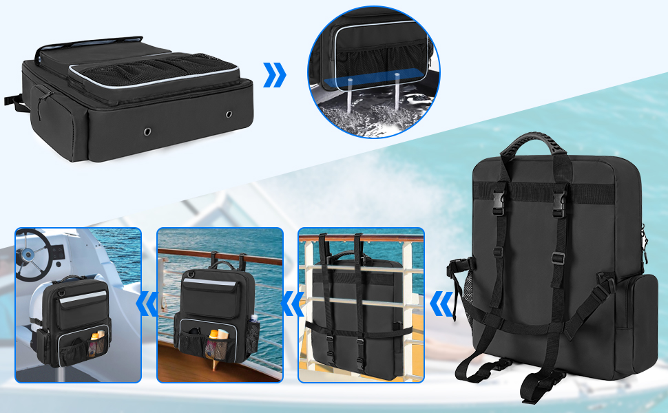 MUST HAVE FOR SAILING: The boat accessories organizers bag adds extra storage, the front and side pockets easily reach stuffs you need. Easy to attach to the boat seat or railing and also easy to get off. Perfect for captain, crew, fishing enthusiast.