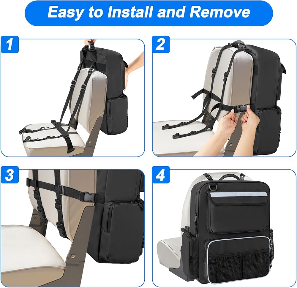 EASY TO INSTALL: The back adjustable straps make it fit for different sizes of boat chairs, just go over and around the seat and fasten it with buckle and tighten. It can be also secured on the boat's railing. The rubber handle for easy carrying.