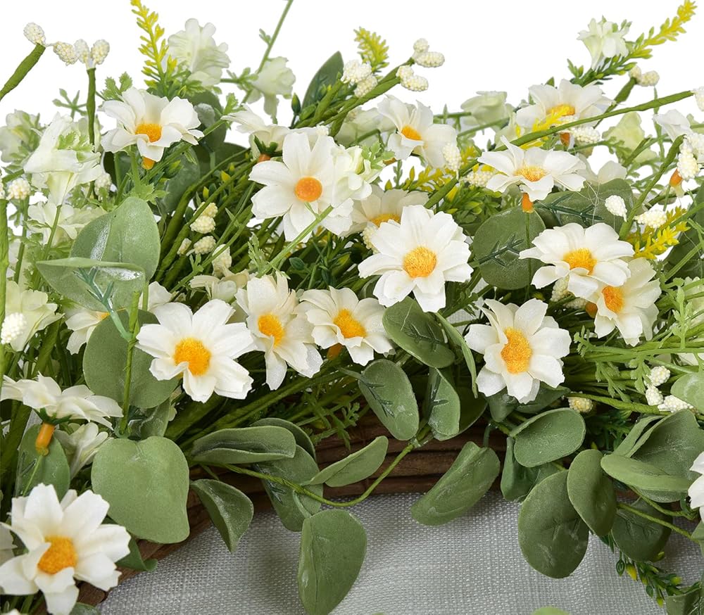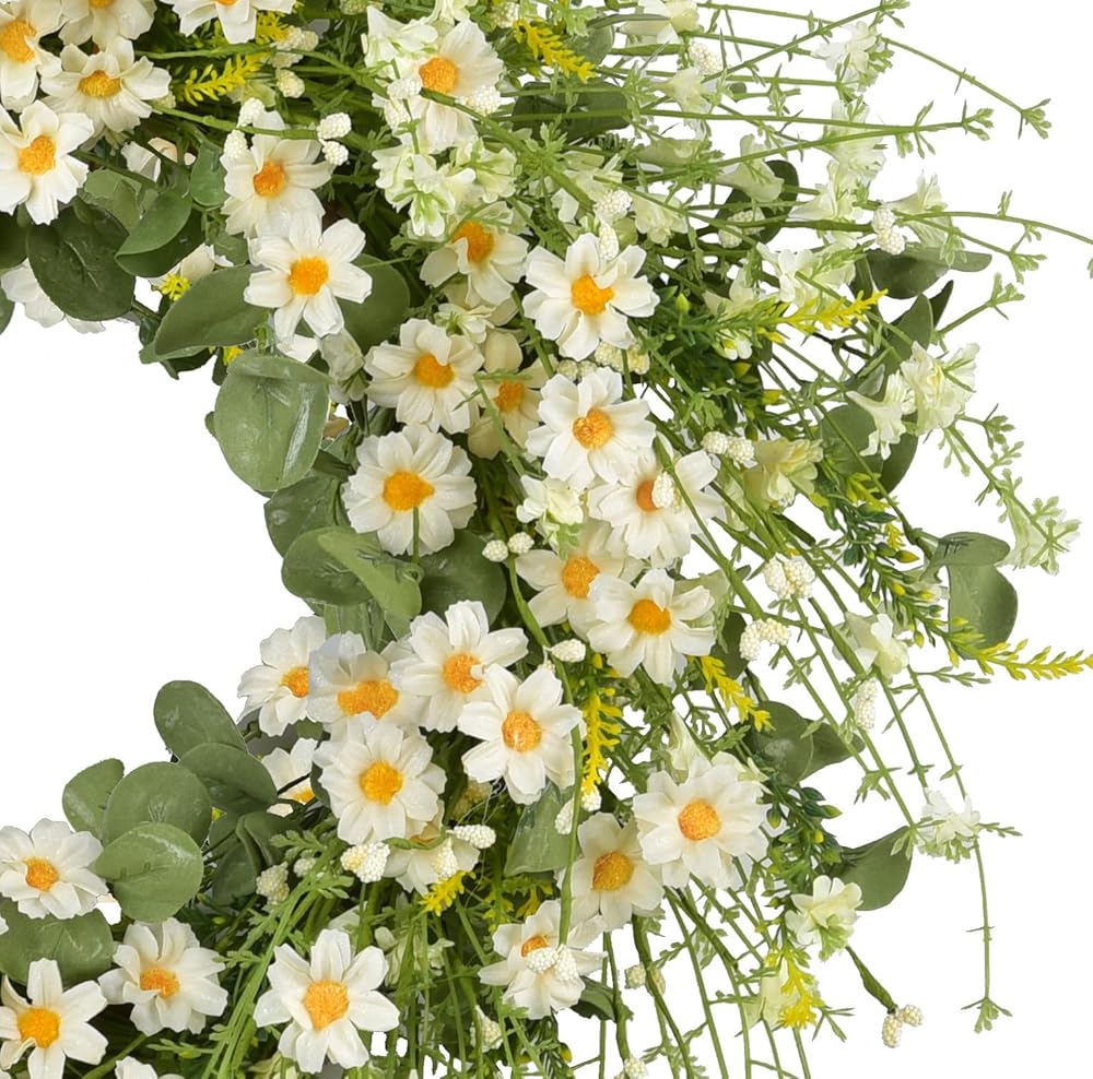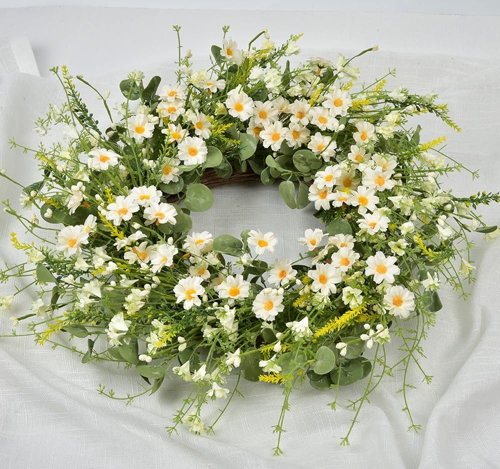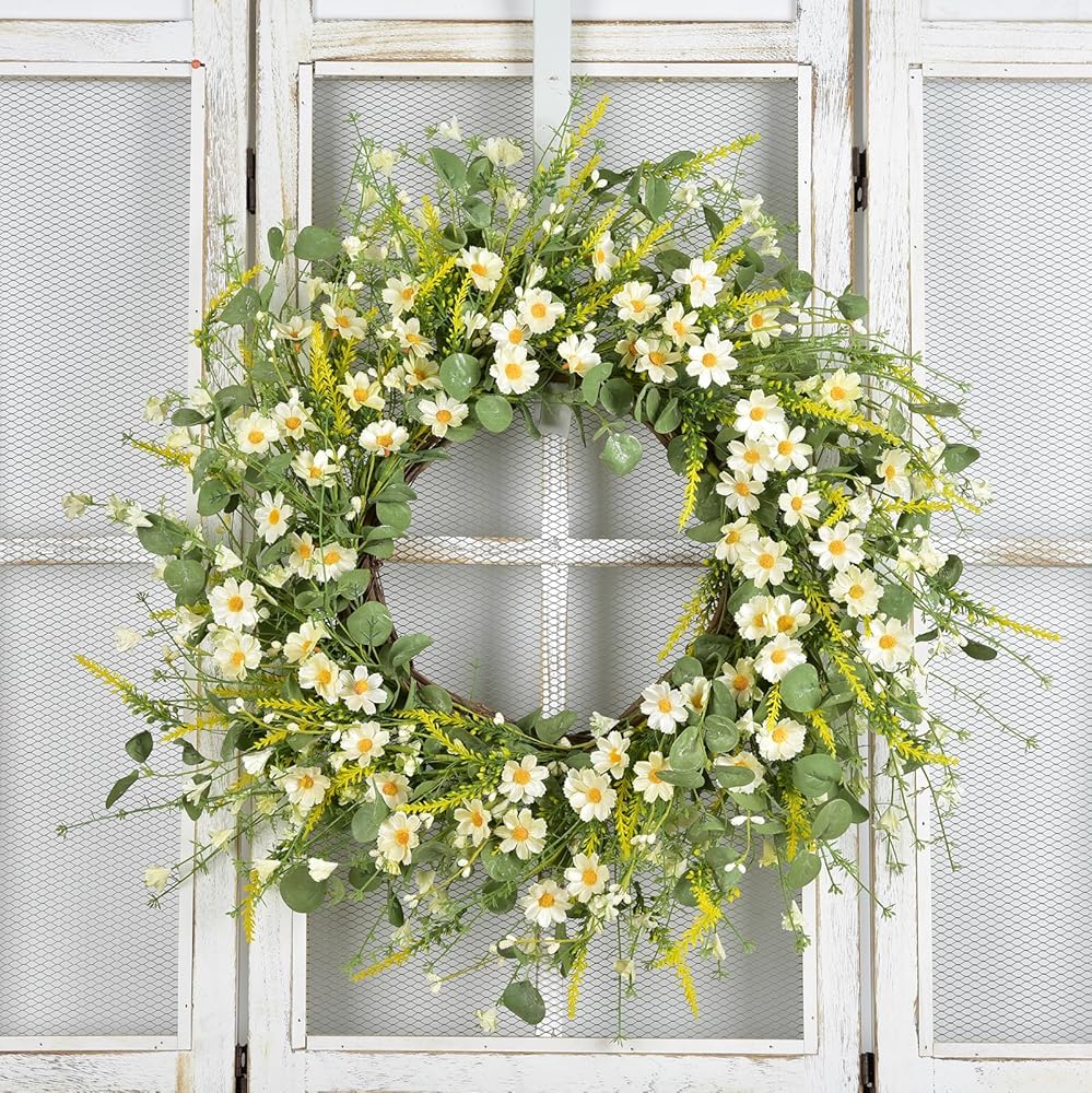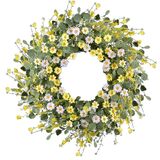 -Artificial flower wreath silk daisy flower wreath spring wreath summer wreath farmhouse wreath front door wreath eucalyptus wreath