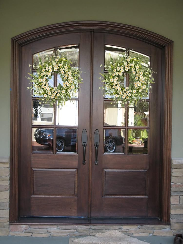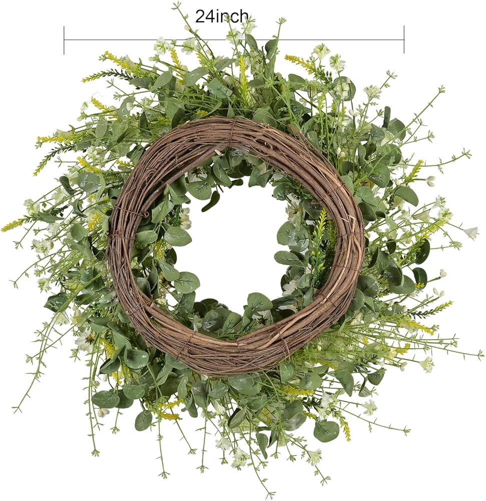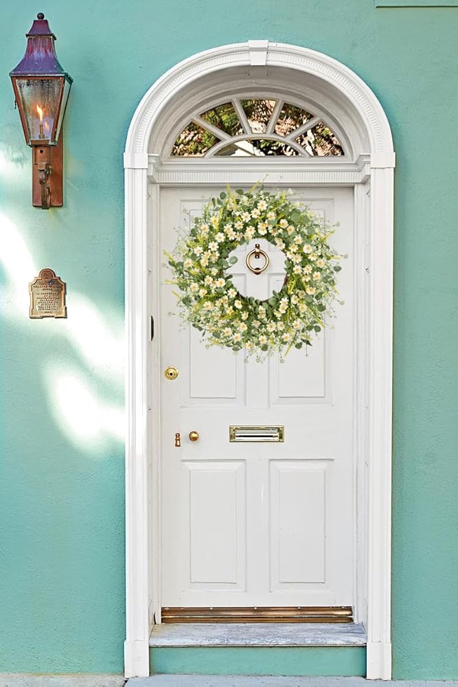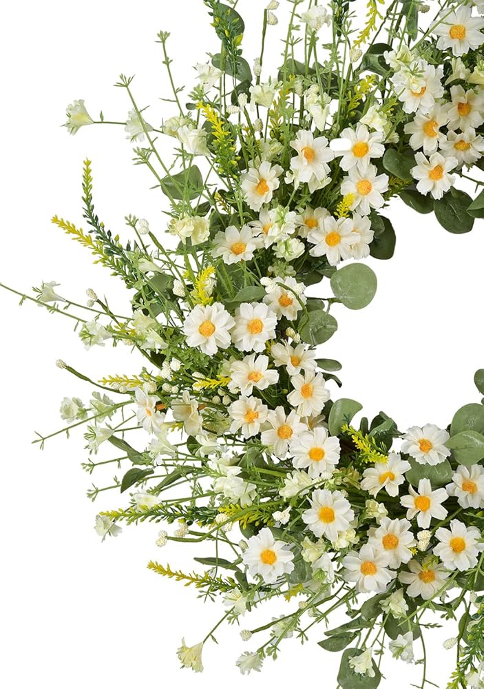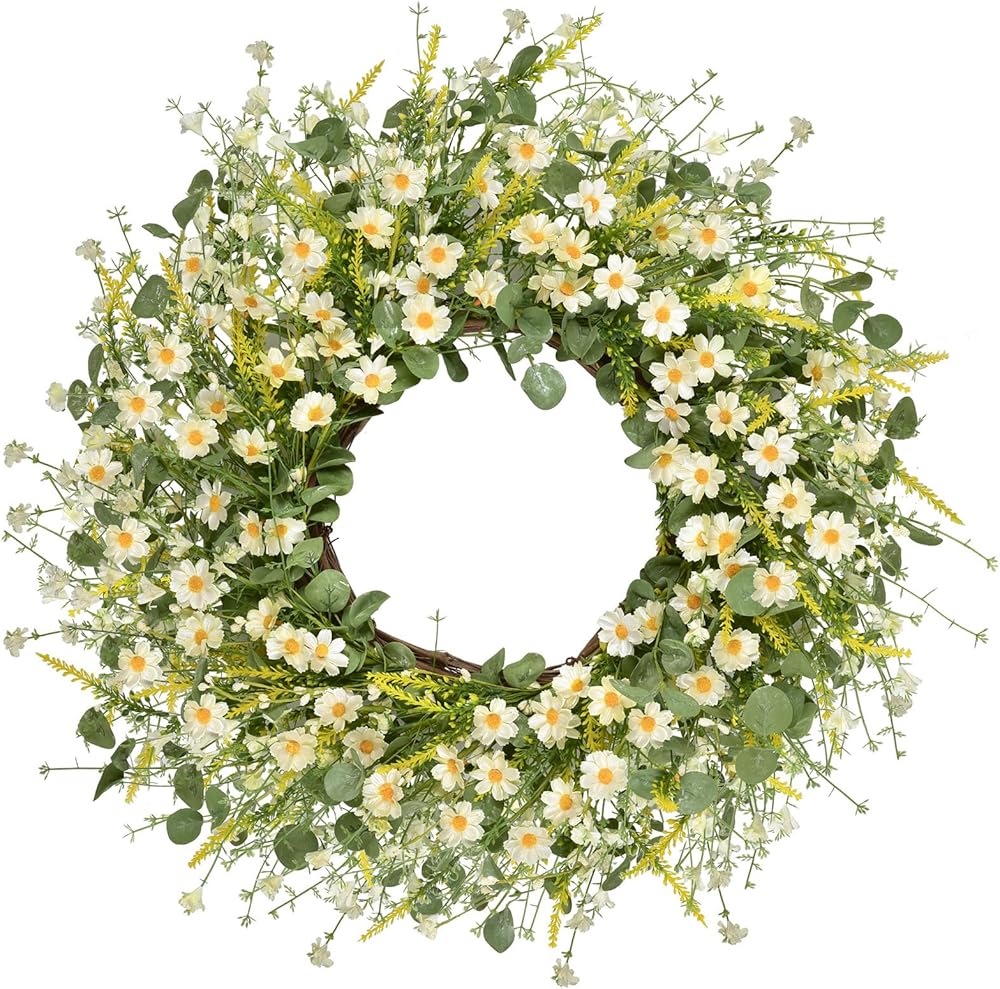 -Artificial flower wreath silk daisy flower wreath spring wreath summer wreath farmhouse wreath front door wreath eucalyptus wreath