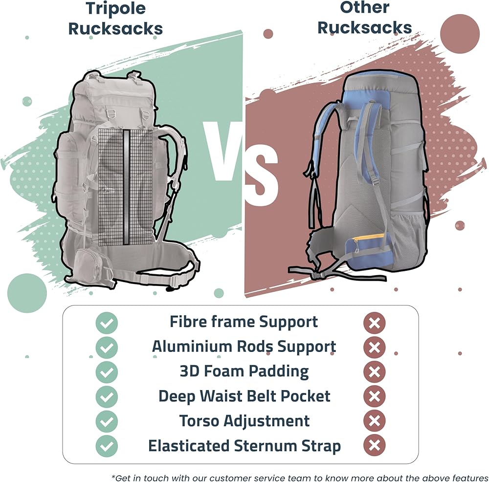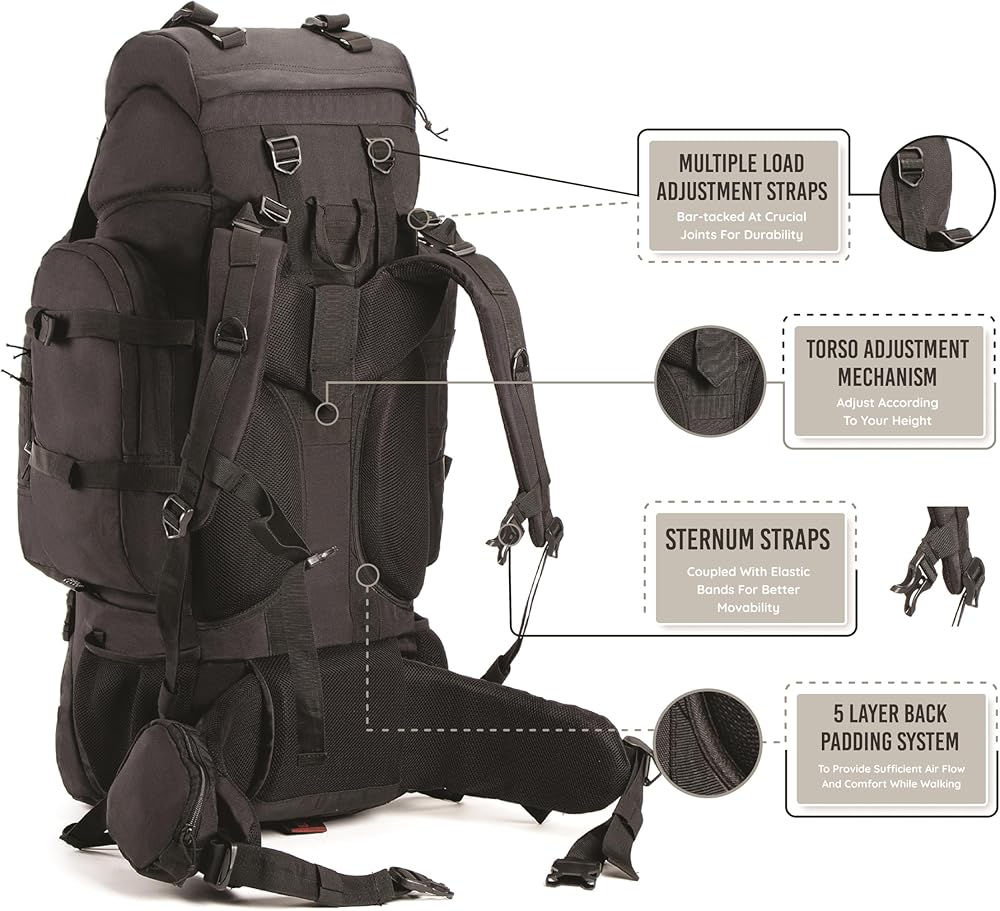 INTERNAL FRAME - The rucksack is designed for long duration travelling and hiking and is equipped with a fibre frame at the back compounded by an aluminum rod to provide maximum load carrying capacity.