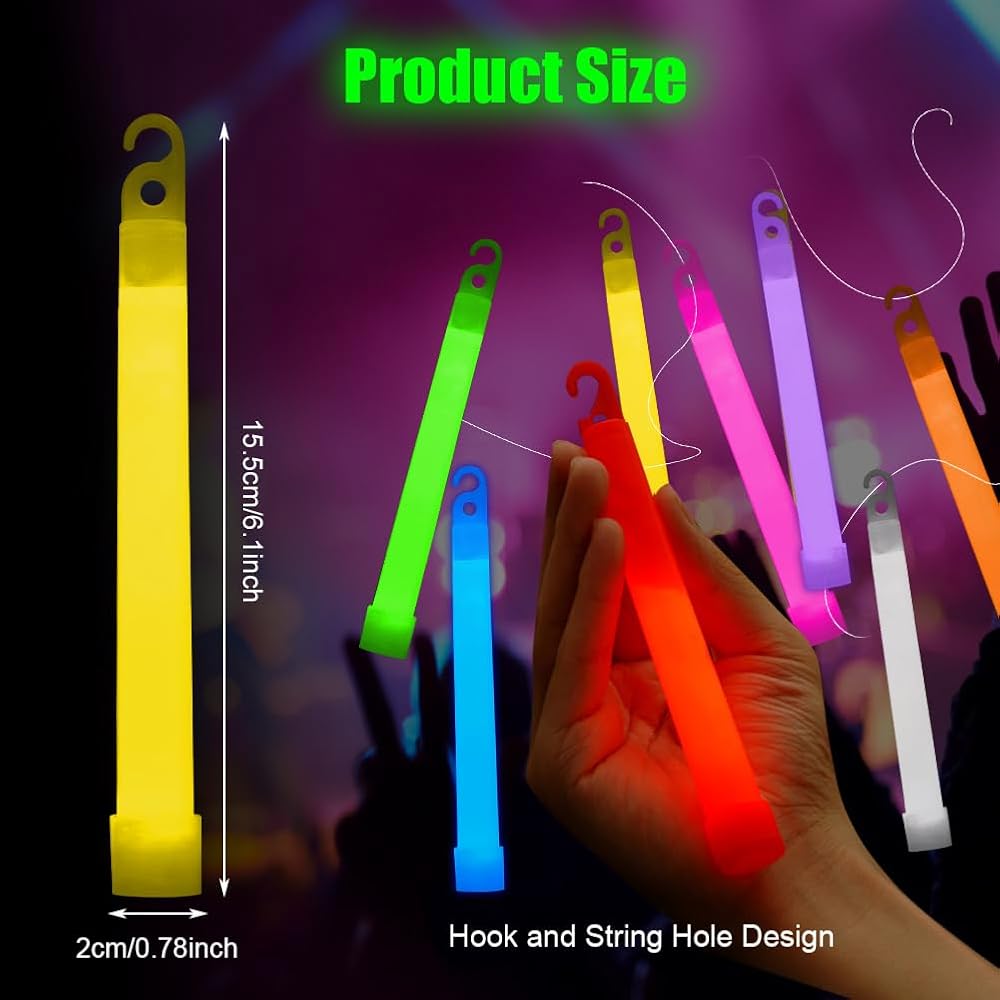 • ✨High Quality: This glow stick is made of High quality PE plastic material, safe and non-toxic, non-irritating odor, waterproof and durable, Glow stick measures 15 cm (6 inches) long and 2 cm in diameter, contains safe liquids inside, once activated, these glow sticks will keep glowing for more than 8-12 hours.