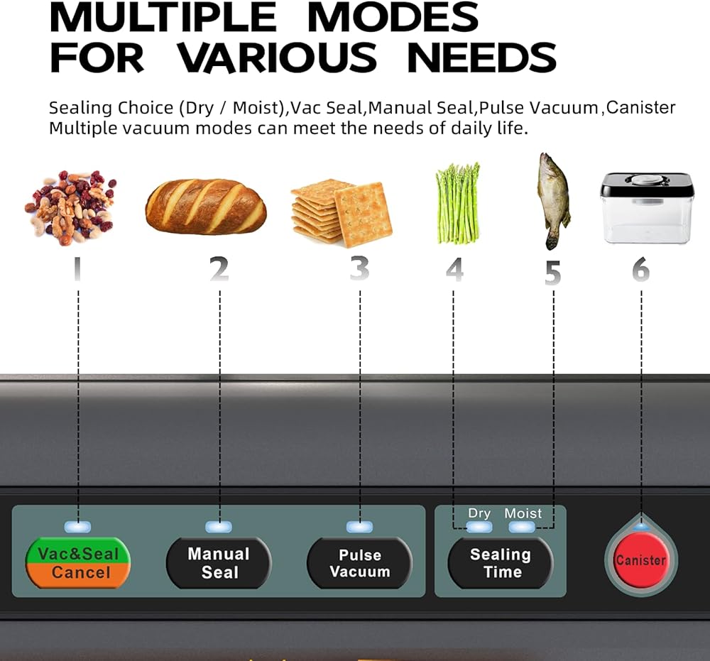 【5 أوضاع وأوضاع متغيرة】آلة إغلاق الطعام بتفريغ الهواء من روبيز باني تحتوي على 5 أوضاع: اختيار الغلق (جاف/رطب)، فراغ وختم، ختم يدوي، ختم نبضي وحاوية. يمكن اختيار أوضاع مختلفة للحفاظ على التفريغ وفقًا لحالة الطعام، والتي يمكن أن تلبي تقريبًا جميع احتياجات التفريغ في الحياة اليومية.