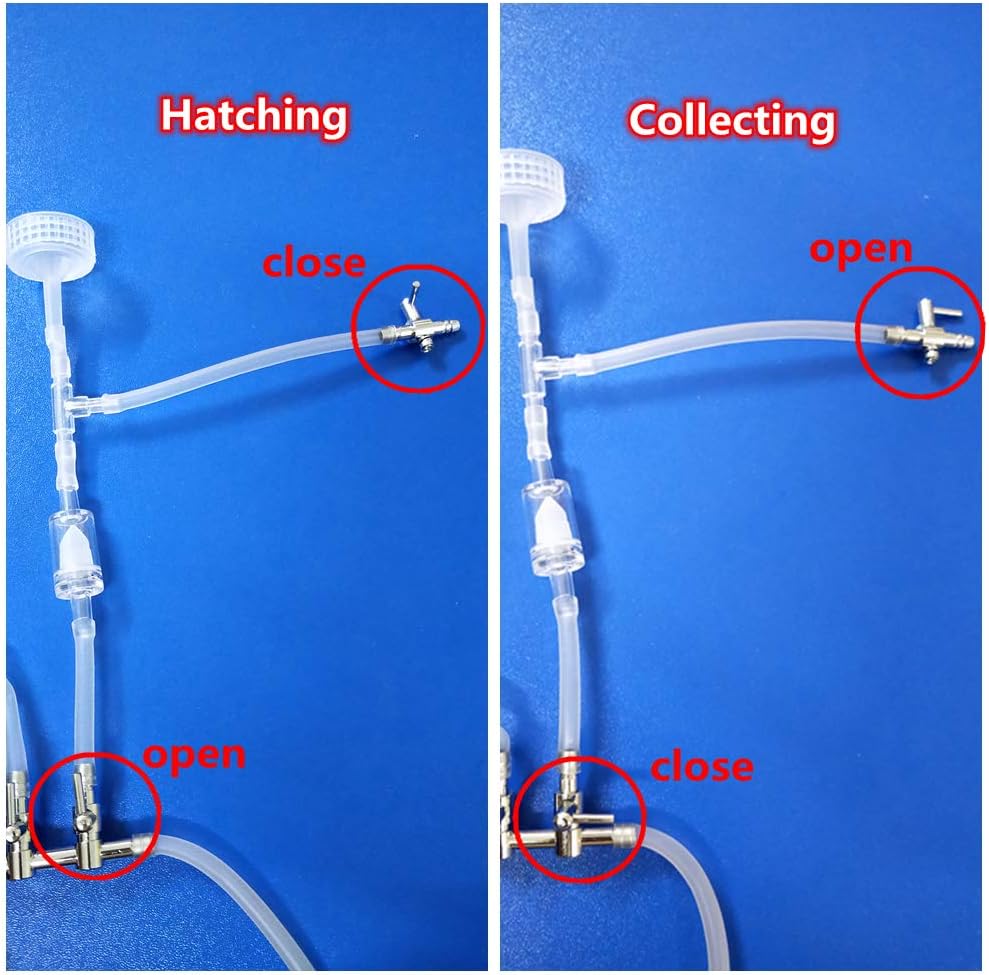استخدام الفقس : قم بتركيبه بزجاجات الصودا ومضخة الهواء، أضف الماء والملح وبيض الروبيان المالح، وتأكد من فتح صمام التحكم في الهواء وإغلاق منفذ الروبيان الملحي وتشغيل مضخة الهواء.