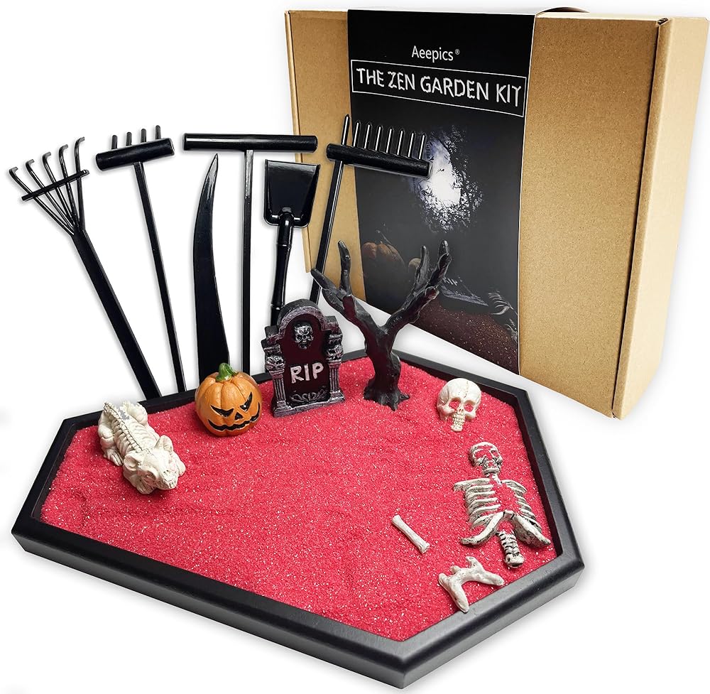 ديكور حديقة Coffin Zen من Aeepics لمكتب المكتب، هدايا قوطية للنساء، صينية مكتب للهالوين، تتضمن المجموعة هيكل عظمي لليقطين وشجرة الكلب وشاهد القبر وأشعل النار (Coffin ZG-A)
