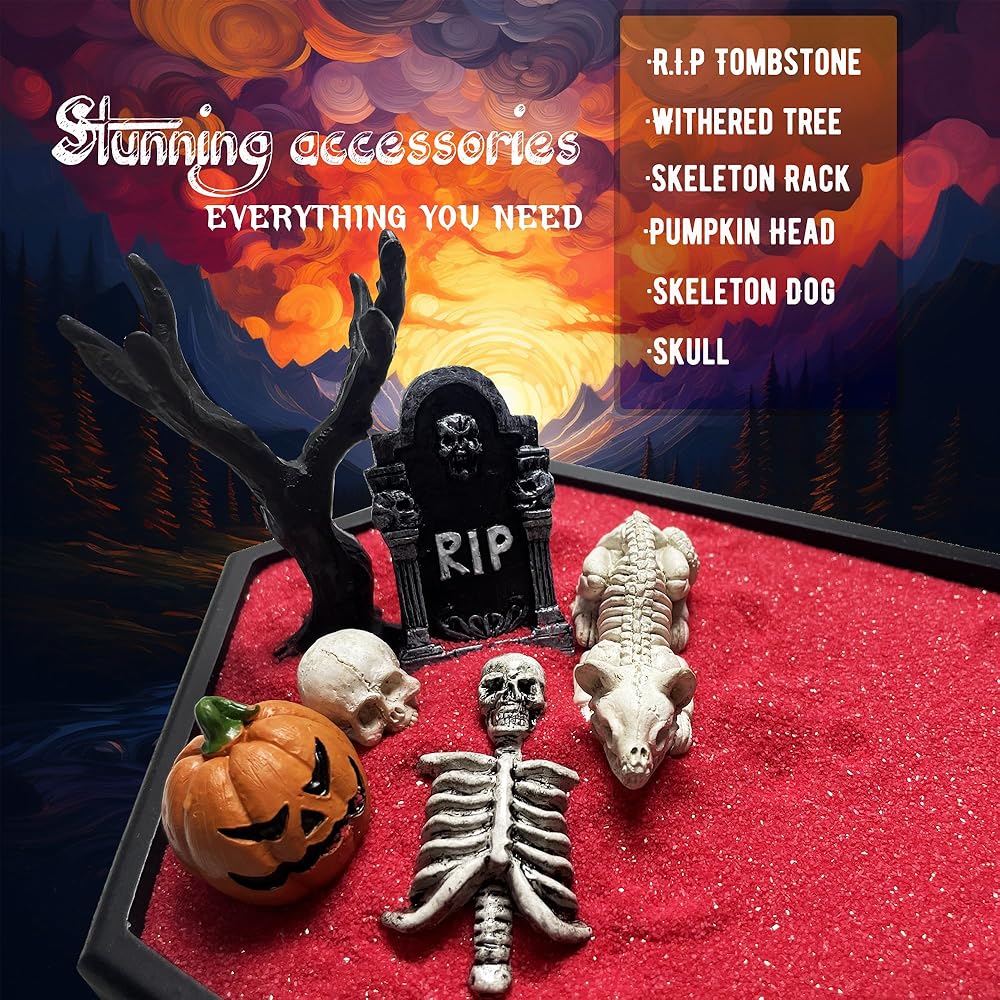 3. العناصر القوطية تنفجر! تتضمن حديقة Horror Zen هذه صينية تابوت، وحقيبة من الرمل الأحمر الناعم، ورأس يقطين، وكلب هيكلي، وشجرة ذابلة، وحجر قبر RIP، ورف هيكلي، و3 مشط. يمكنك مطابقة الملحقات الموجودة على التابوت بحرية!